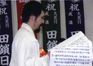 式典中、佐藤光則副伝師より初行木剣相承許證と修法師辞令が授与され、佳史師行中の苦修錬行は範を成す讃辞があり、又、佳史師は師父を始め寺族と檀信徒から、力強い励ましと温かい心に支えられ百日励む事が出来た事への感謝と、不惜身命死身弘法の決意を述べ、成満の喜びに沸いていた。