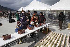 岩手県大船渡市本増寺(木村勝行住職)の檀信徒や市民が実行委員となり開催された「東日本大震災一周年 鎮魂と追悼市民のつどい」。会場となった漁港には仮設住宅で暮らす中学生や介護施設の利用者らの願いなどが書かれた多くの灯籠が吊るされた。さらに参列者の手によって港から同市の犠牲者と行方不明者数と同じ424個の折り鶴、出航した船から1,000個の灯籠などが供養のために海へと流された。