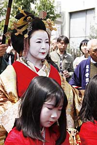 帝(天皇)との謁見を許された芸妓最高の称号「太夫」。京都市常照寺(奥田正叡住職)に眠る、「寛永三名妓、天下随一希代の太夫」と謳われた二代目吉野太夫への花供養が4月14日に営まれた。当日は、現在の太夫たちが同寺まで練り行列し、法要で献茶などを行うため、その姿を一目見ようと全国から大勢の観光客や参拝者が訪れた。この花供養は法要に参列した門川大作京都市長が挨拶で、「京都の文化行事」と述べるほど、古都の風物詩となっている。