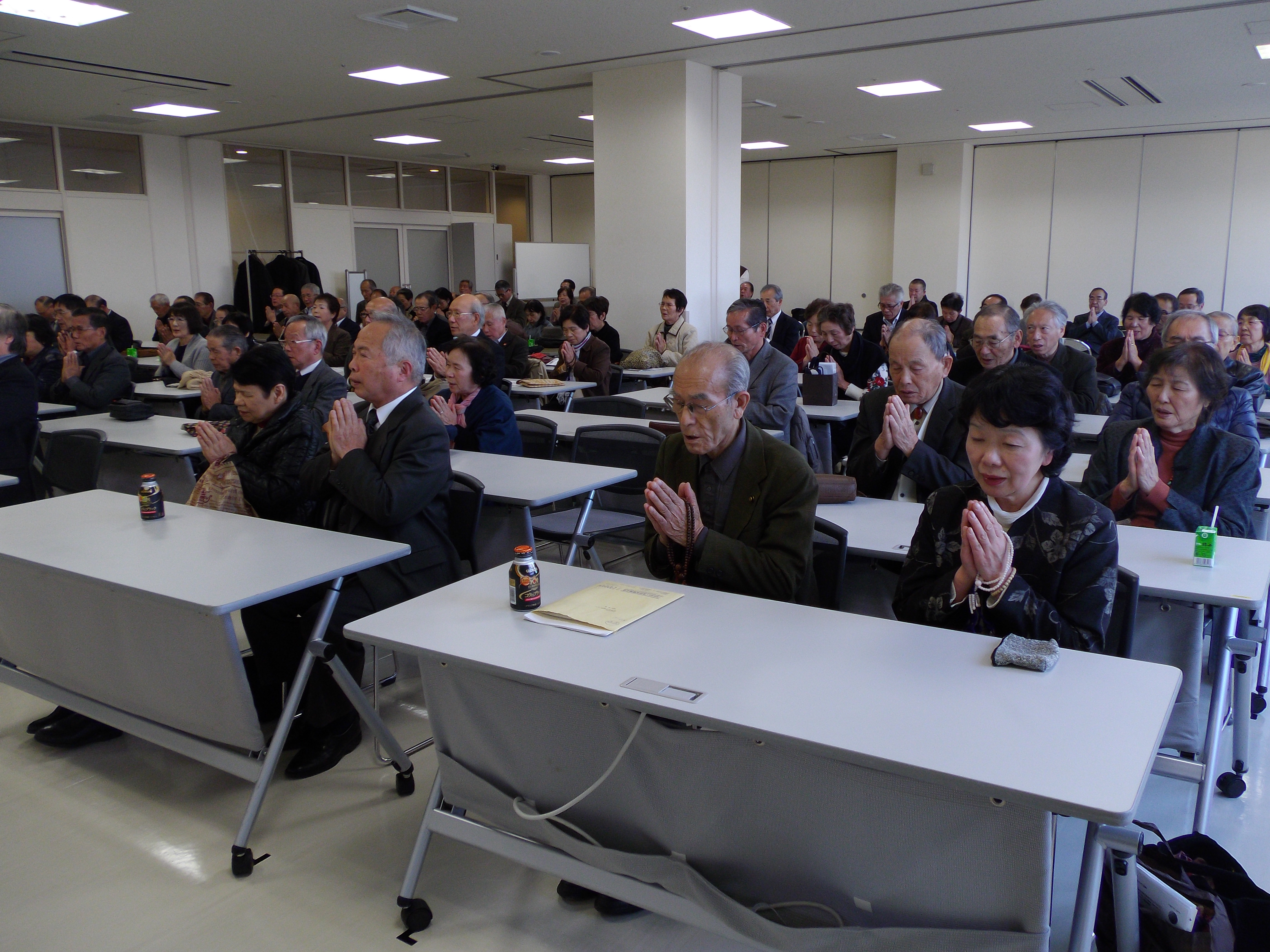 【富山】平成25年11月24日(日)午前10時~ 富山県高岡市ウィングウィング高岡にて、主催 日蓮宗富山県宗務所、共催 日蓮宗富山県檀信徒協議会・日蓮宗信教会一日幹部檀信徒研修道場が開催されました。 富山県内各寺院から限定五名ずつ推選された檀信徒が、計100名参加しました。また、寺庭婦人・教師合わせて15名の参加でした。法味言上の後、講題を「私たちにとっての合掌とは」と題し、3名の講師から各1時間ずつ、計3時間の講義を受けました。①「宗門とお寺の檀信徒」 講師 富山県宗務所長 末吉觀道上人②「法華経にみる合掌の心」講師 富山県教化センター長 間宮啓壬上人③「現代社会と合掌の心」 講師 富山県布教師会長 栗原啓允上人 会場は満席に埋まり、