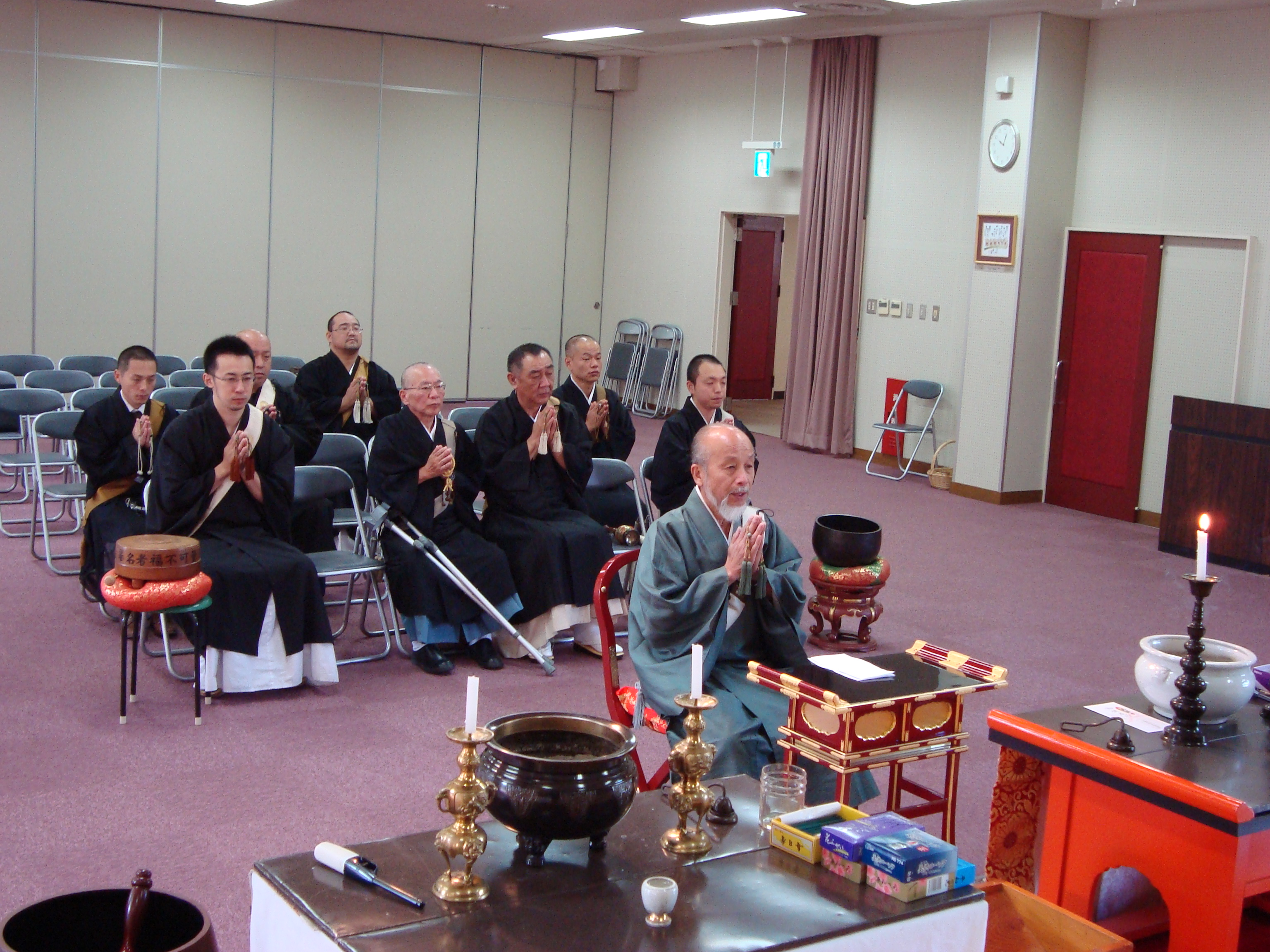 まず午前十時、各宗派の祭壇が並ぶ園内の礼拝堂の、身延深敬園の綱脇妙龍上人が奉納したご本尊と日蓮聖人像が安置された日蓮宗の祭壇の前で、一同は法味を言上し、導師の濵田所長が、園内で亡くなられた物故者の他、全国ハンセン病施設の物故者及び有縁の精霊、強制隔離政策の時代に堕胎を強いられた無明嬰児の霊に回向し、冥福を祈った。