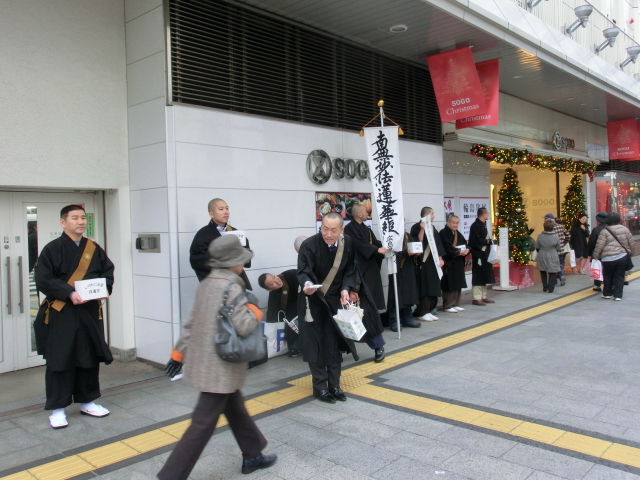 【広島】平成25年12月11日(水)より、広島県社会教化事業協会と広島県日蓮宗青年会の2団体合同の歳末助け合い募金が広島そごう前において、寒風が吹き冷え込む中行われた。