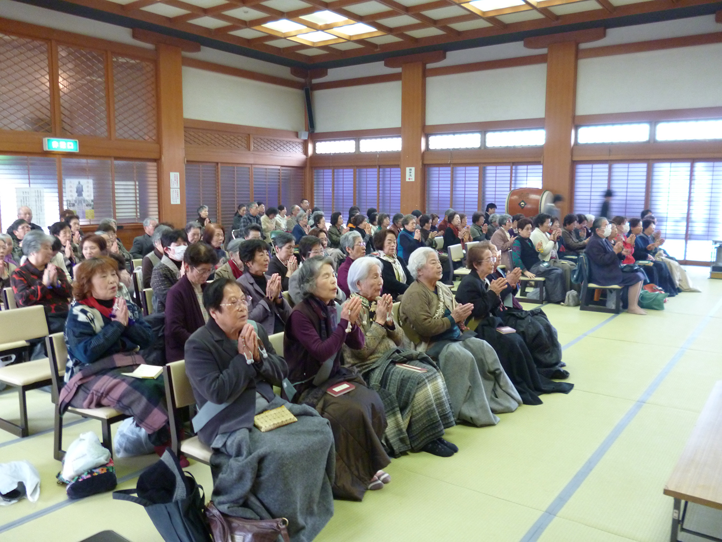 【福岡】福岡組(永江尚幸副長福岡市徳栄寺住職)は3月5日、福岡市日蓮聖人銅像護持教会において、檀信徒約120名と共に、統一信行「お題目の集い」を行った。