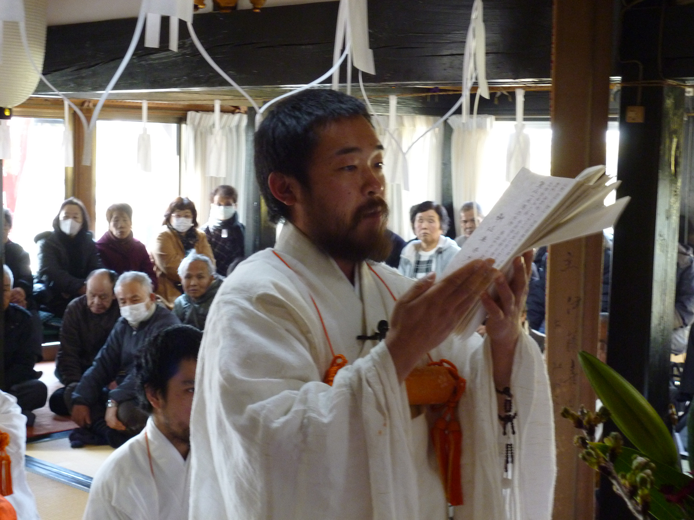 同行僧と共に力強い水行を行い、奉告式で常行師は「自分一人ではなく、支えて下さった檀家や先輩僧のおかげで成満することができました。蓄えた福徳力をもって檀信徒と共にお題目を唱えて参りたい」と力強く奉告。苦修練行の姿に檀信徒が魅入っていた。