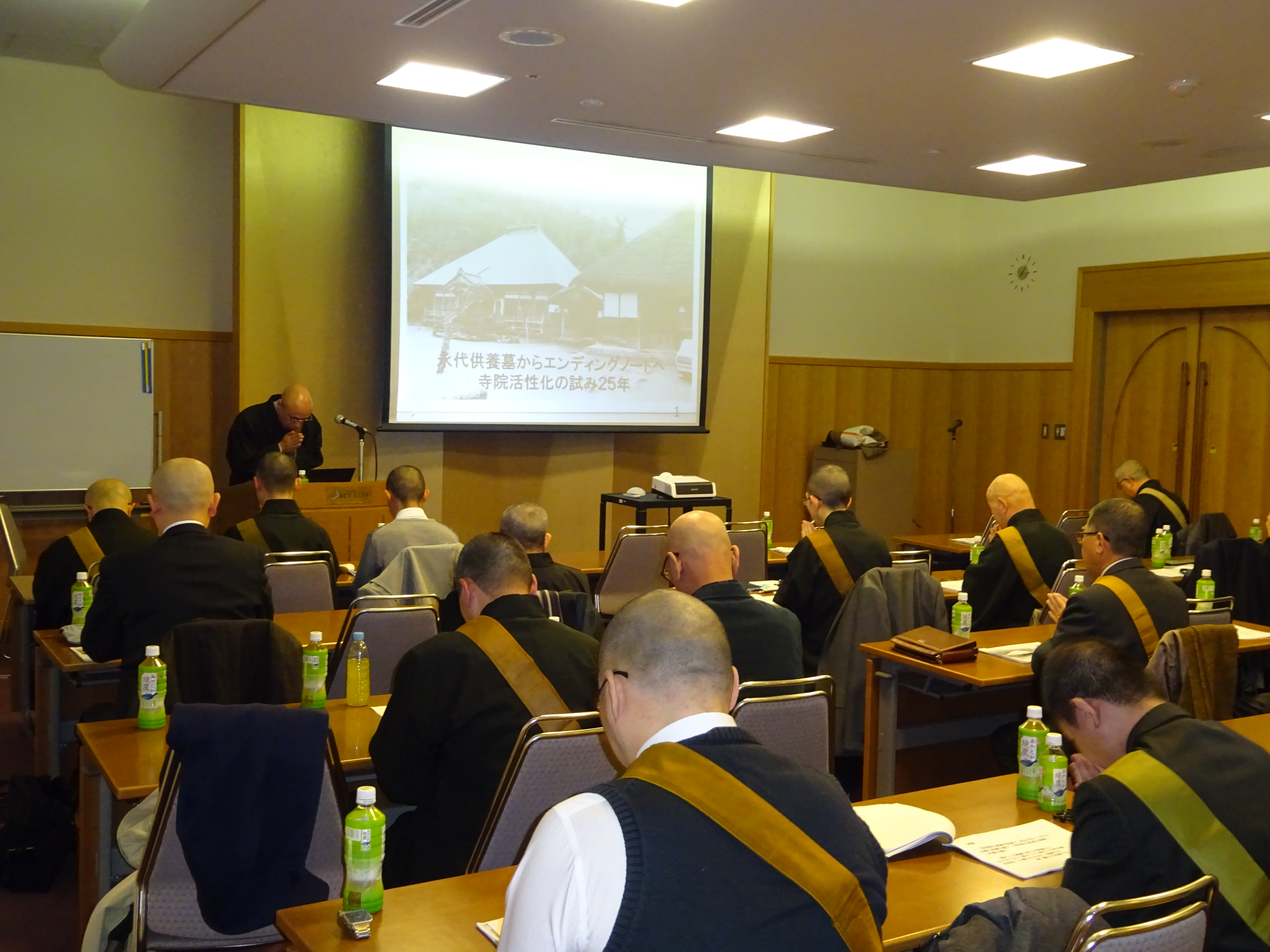 研修では新潟県妙光寺住職の小川英爾師が「永代供養墓からエンディングノートへ寺院活性化の試み25年」と題し、講演。小川師は過去から現在までの寺院と社会の関係をかえりみ、「昔の寺院は学校・病院などの始まりだった。しかし今はNPO法人などが臨終までのサポートをしている。寺院の役割をもう一度考えなければならない」と述べた。厳しい運営が予想できるこれからの寺院については「小さなことやできることから着手して、心から支持される寺院づくりを目指さなければならない」と語った。