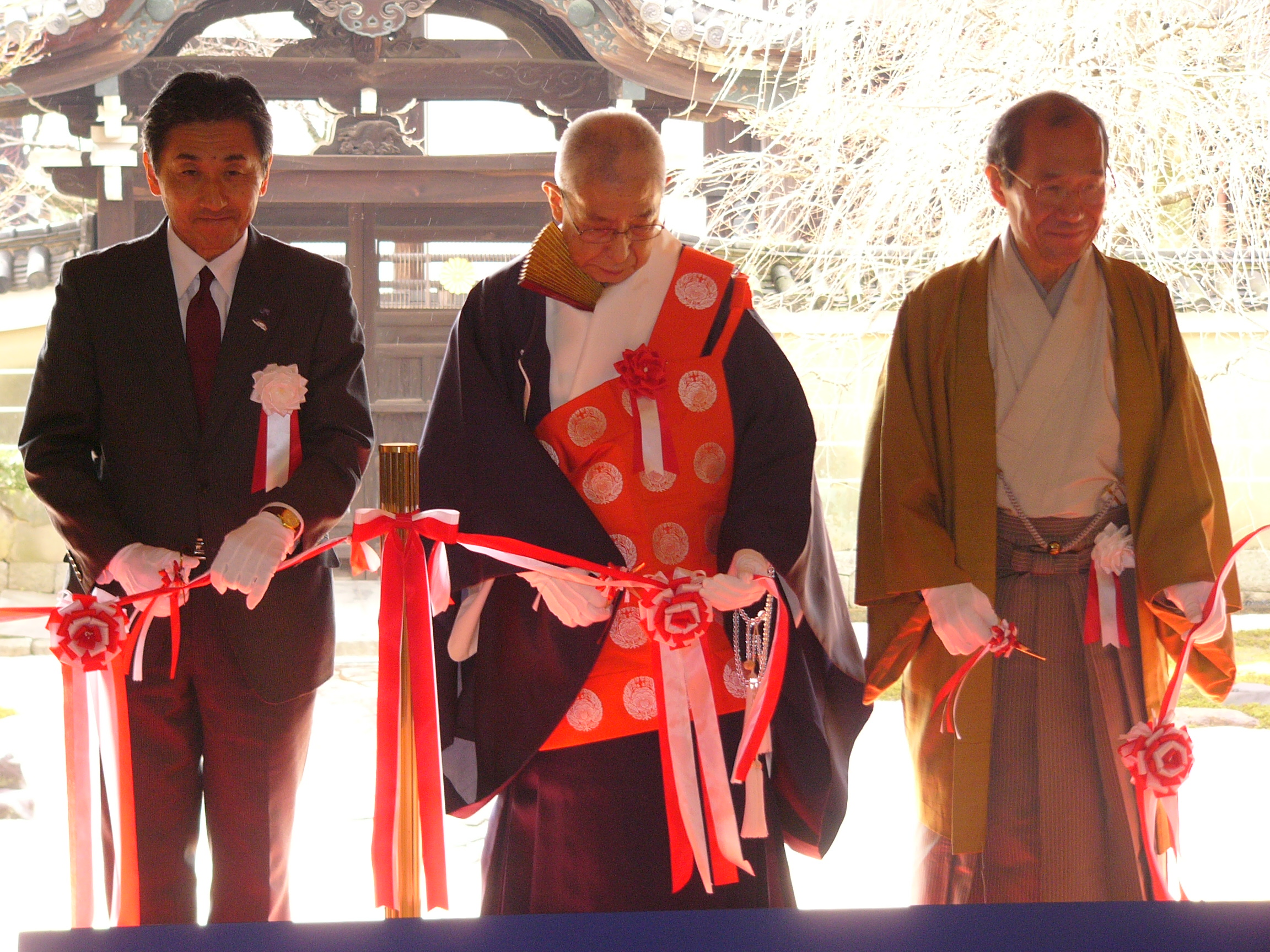 妙顯寺貫首三田村日正猊下、京都市長門川大作氏、京都市観光協会会長柏原康夫氏等が出席され、「龍華飛翔(四海唱導)の庭」をバックにテープカットが行われ、ポスターのモデルとなった鈴鹿可奈子氏(聖護院八ツ橋総本店専務)や舞を奉納した花街・宮川町の舞妓達が華を添えた。