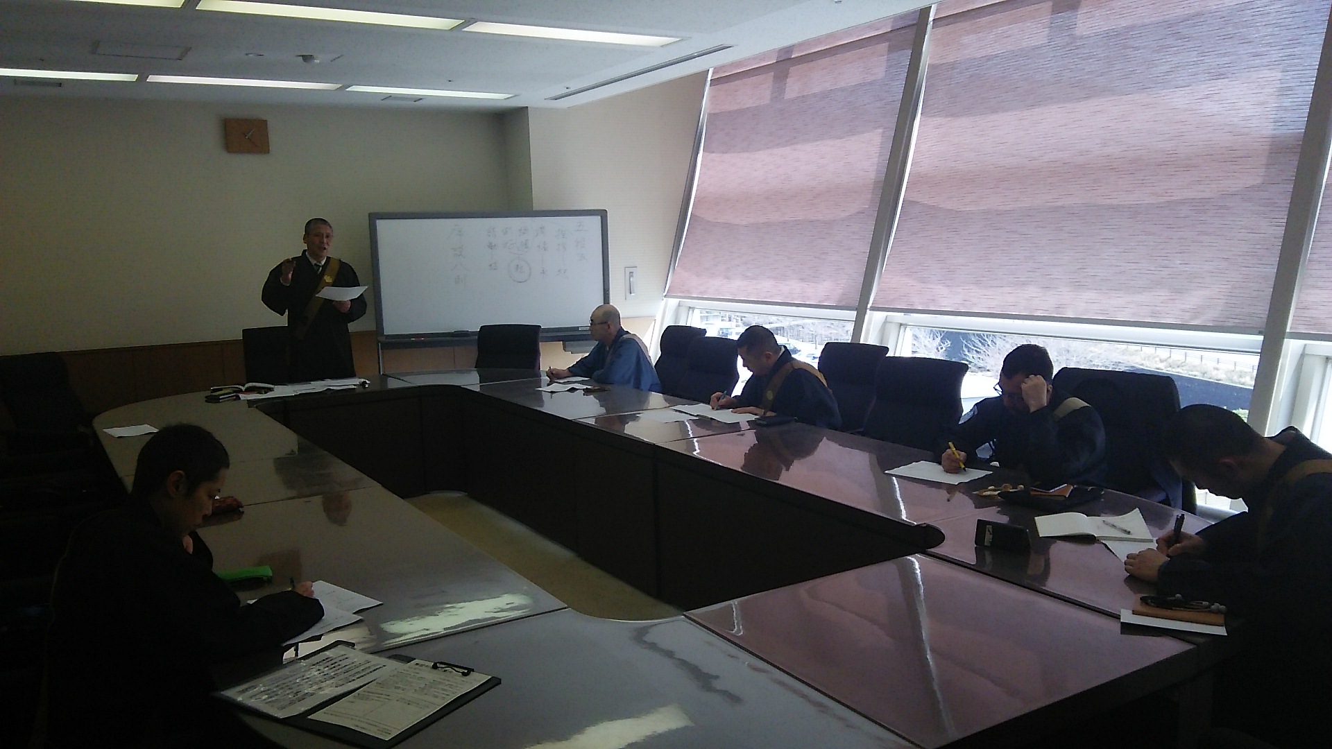 【愛知三河】布教師会(河合海延会長)は三月二十四日、ハピネスヒル幸田の会議室において「冠婚葬祭における五分間説教」をテーマに法話研修会を行った。講師に三大寺聡温上人(犬山市妙感寺住職)を招き、教師六名が研鑚に励んだ。三大寺上人の講義の後、教師が実際に説教をし、講評をいただくという形式で研修は行われた。河合会長は「研修の場なので失敗を恐れず話すという姿勢が大切。この研修会が皆の成長の一助となれば。」と述べていた。参加した教師は「講評をいただき自分の法話を見つめ直す良い機会になった。」と話していた。