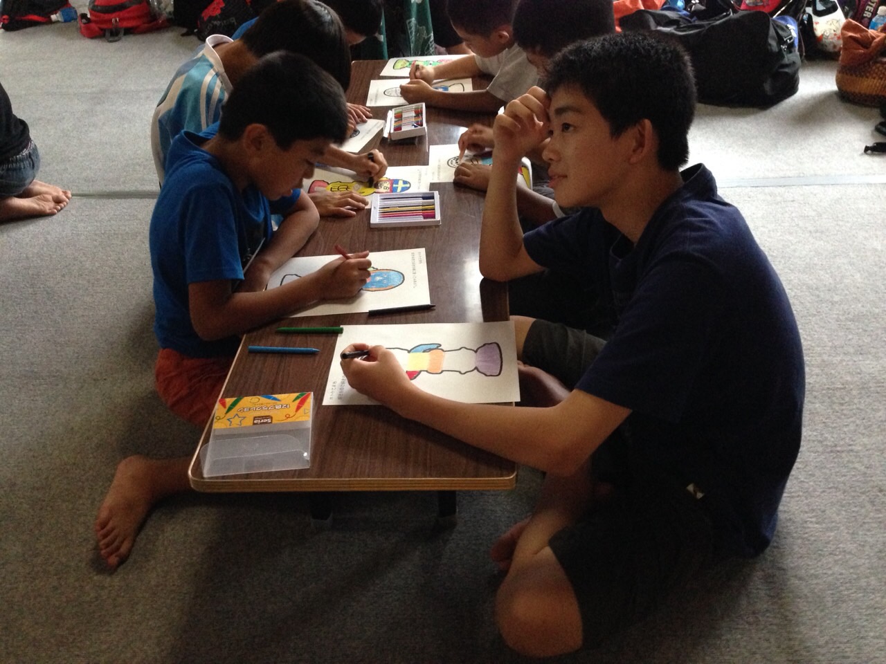 【石川一】平成二十七年七月三十日、金沢からバスで福井へと向かい、大乗寺を会場として一泊二日の修養道場を行った。今年は三十四人の子どもが参加し、例年通り海やカヌー、花火などの楽しい時間はもちろん、今年は初の試みとして子どもたちが描いた絵でTシャツを作った。テーマは誕生仏で、お釈迦様の生い立ちの話を聞いた子どもたちは、皆想像を膨らませながら一人一人個性溢れる誕生仏を描いた。