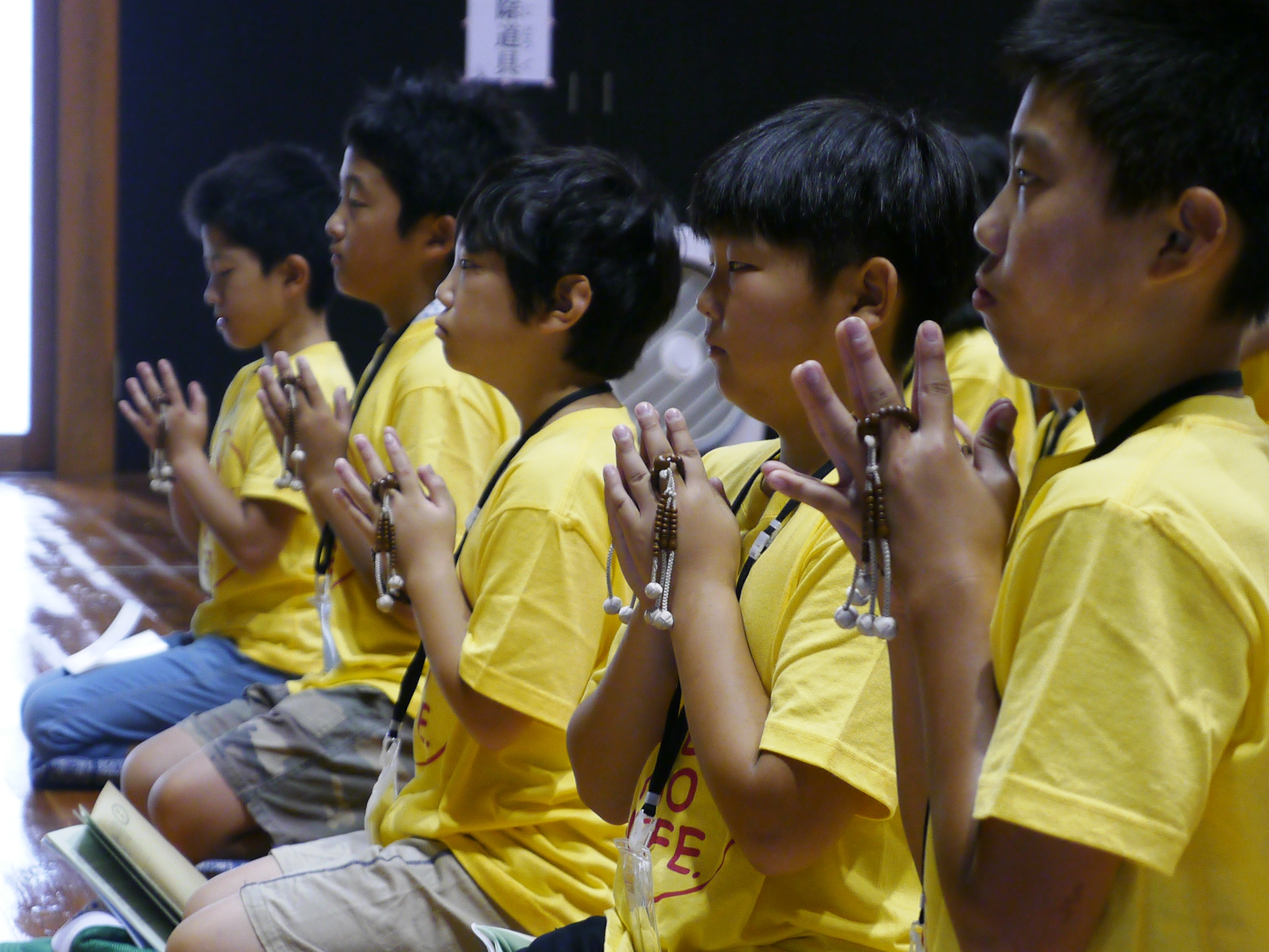 例年この修養道場では、仏事に参加する機会の少ない子ども達のために、合掌の仕方やお数珠の持ち方などといった基本的な作法などを教えている。