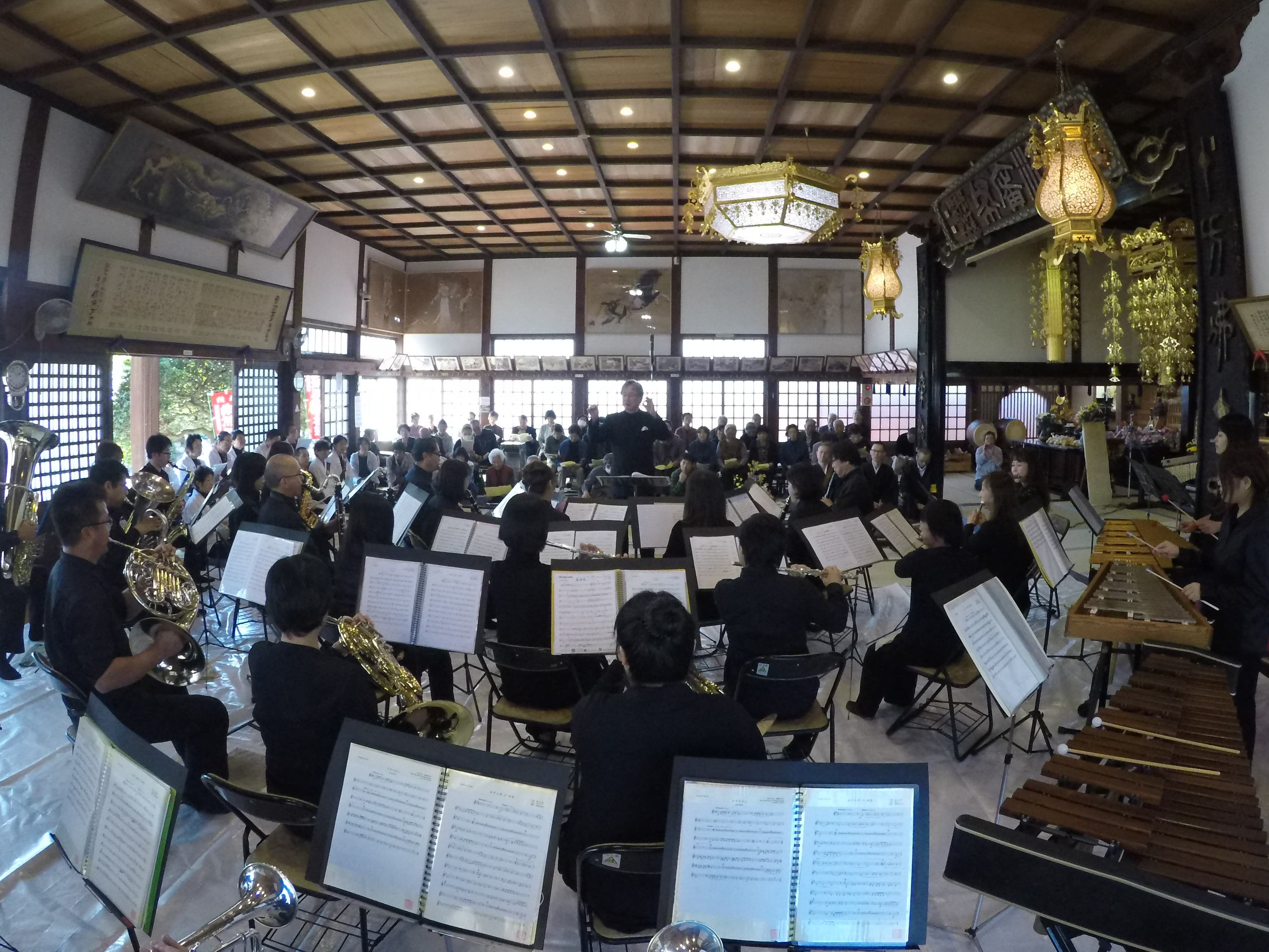 会場となった一乗寺本堂には、40名を超える楽団員と一乗寺和讃隊、60名ほどの聴衆が入堂しており、厳かな法要や一般的なコンサート会場のどちらとも違う雰囲気の中で1時間程の演奏会が行われた。