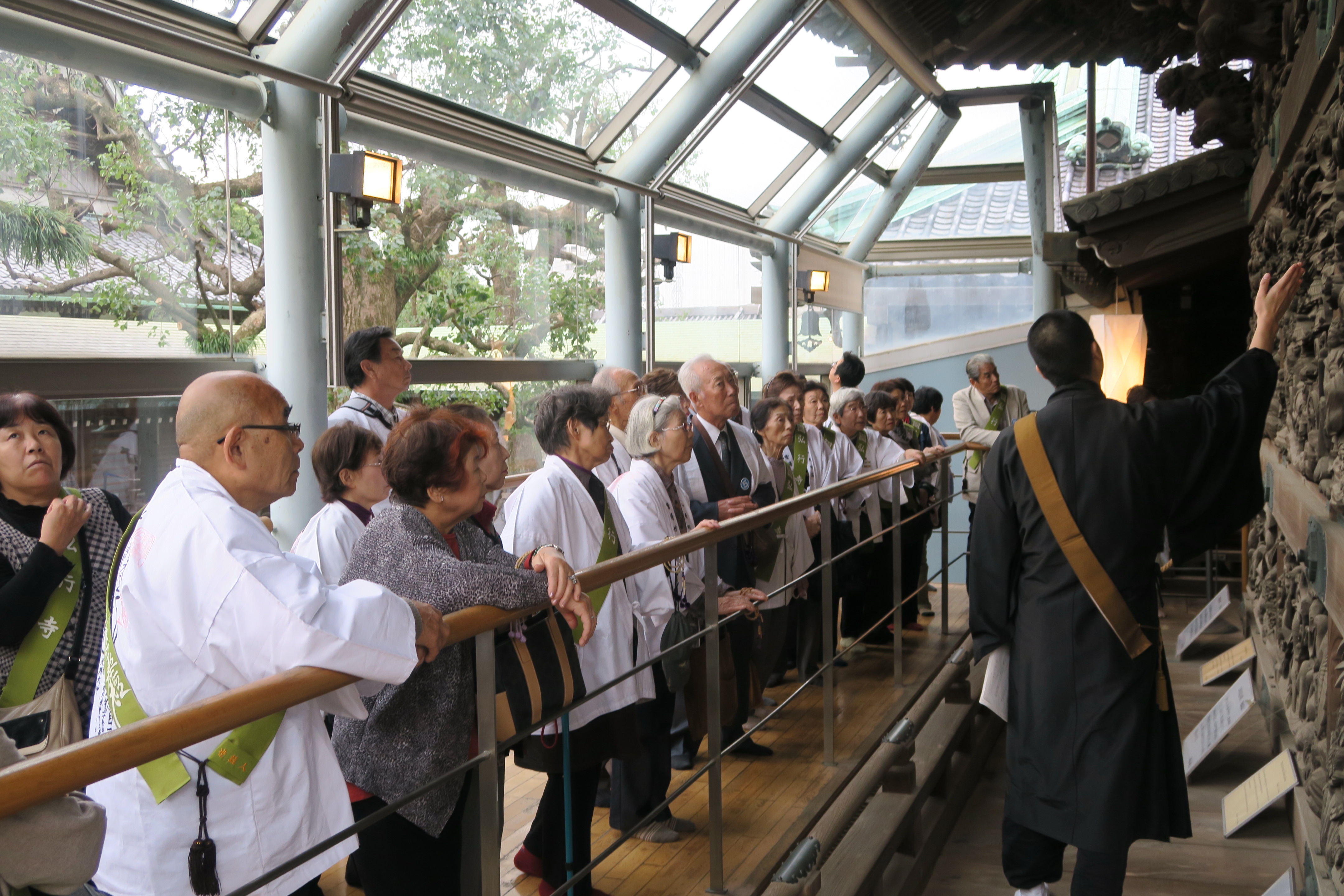 午前八時、五台のバスが各地を出発した各バスでは、天才仏師運慶や題経寺の帝釈天について車中法話が行われた。