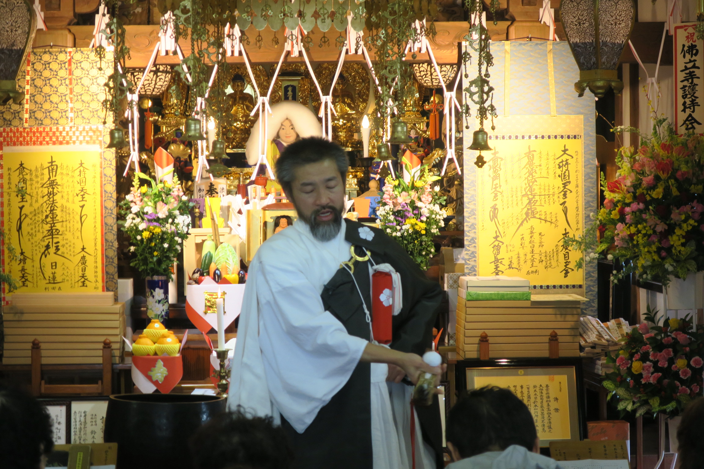 管内有縁の僧侶と多くの檀信徒が見守る中、管内より入行した4名の行僧と共に本堂前にて水行が行われた。その後、本堂にて帰山奉告式と法楽加持が厳かに執り行われ、本学上人は時折声を詰まらせながらも報告文を読み上げ、謝辞を述べられていた。