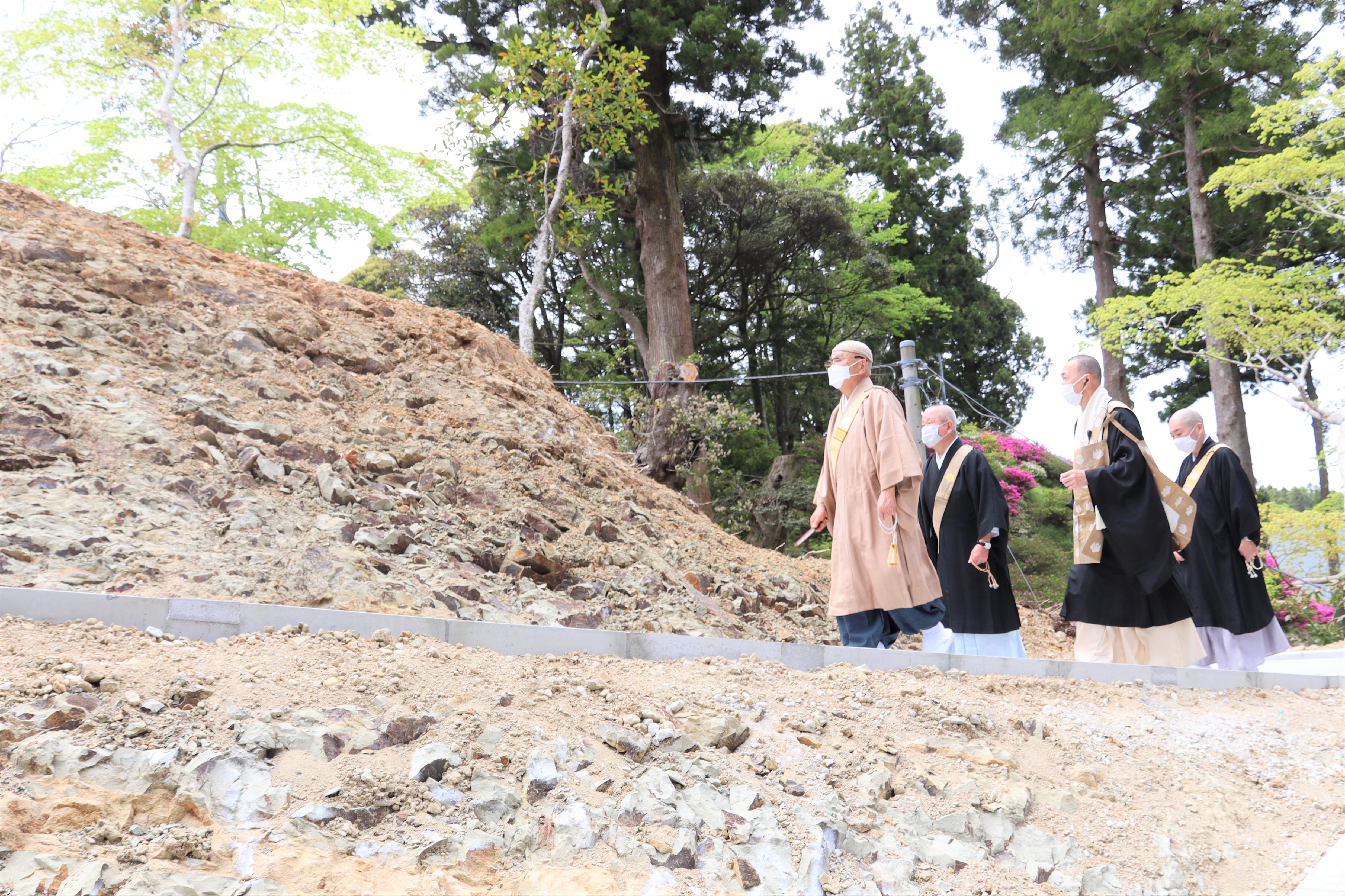 【千葉南】4月27日に大本山清澄寺で進められている旭が森境内二期環境整備の工事進捗状況を菅野日彰管長猊下が視察された。