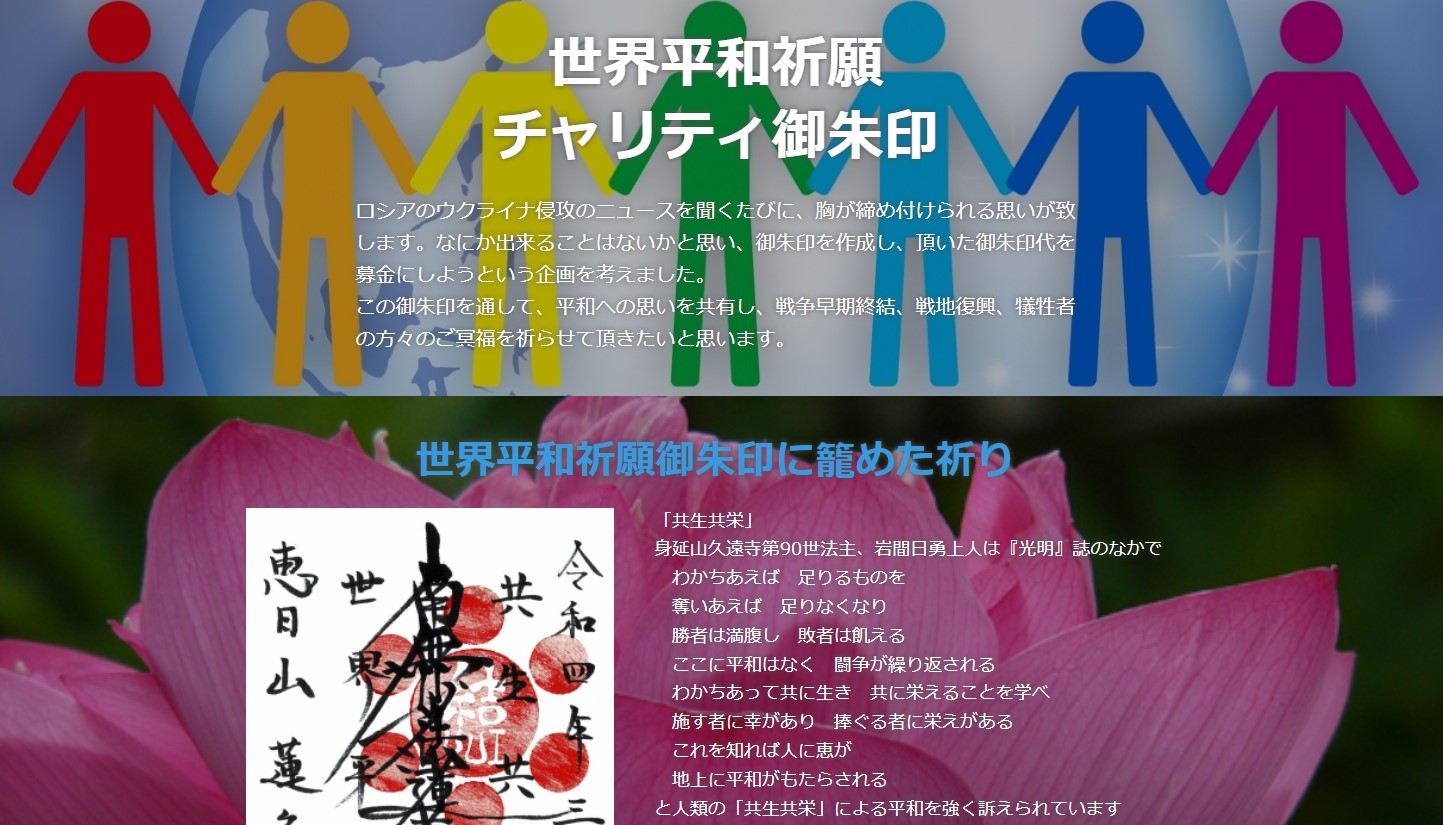 【千葉西】君津市蓮久寺(江口隆晶住職)は、ロシアのウクライナ侵攻後「世界平和祈願チャリティ御朱印」を作成した。その御朱印代を日本ユニセフ協会の「ウクライナ緊急募金」に寄託すべく、オンラインで募金活動を行った。