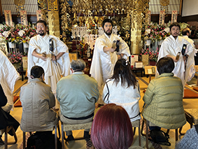 【埼玉】令和6年2月11日、さいたま市の法光寺(渡邊大賢住職)において、副住職・渡邊大延上人の帰山報告式が厳粛に執り行われた。大延上人は本年度、二度目となる日蓮宗大荒行を成満し、その帰山を祝うため、約130名の檀信徒が参列した。