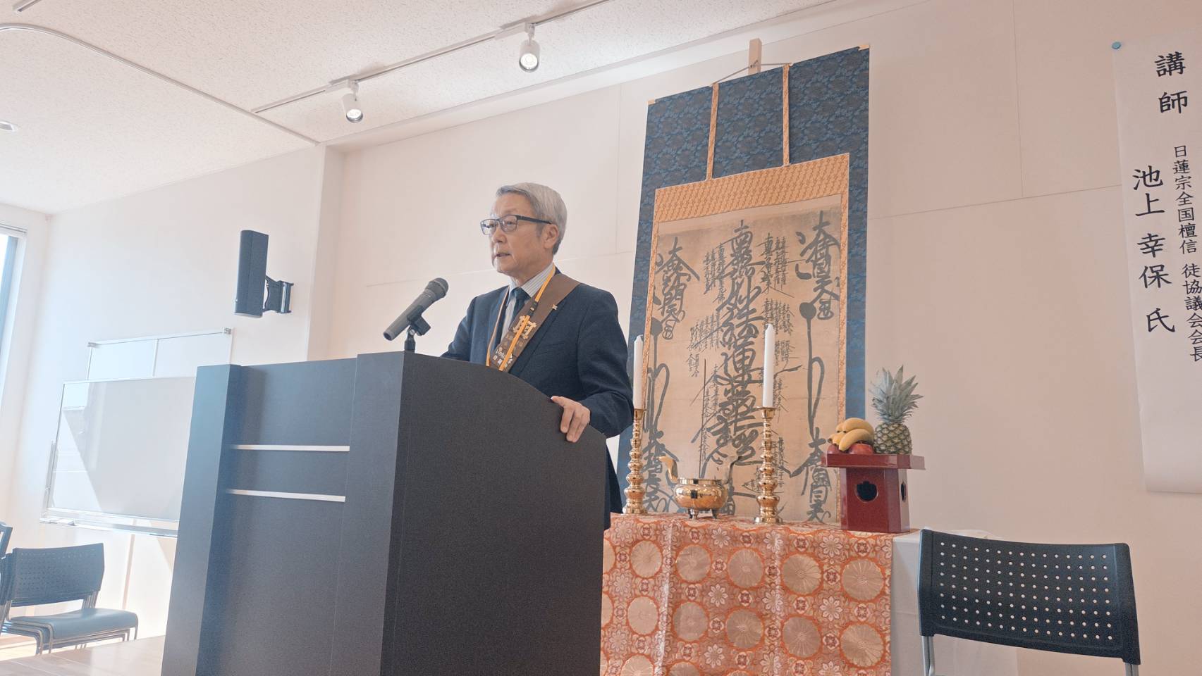 全員で唱題行の後に、今年度の研修のテーマ「いのちと信仰の繋がり~信仰と生活~」として最初に日蓮宗全国檀信徒協議会会長・池上 幸保氏に「私の信仰」というお話しをしていただき、続いて真言宗観音寺住職・宗教臨床師・米本 智昭氏」に「生老病死に寄り添うこと」という講話をいただきました。