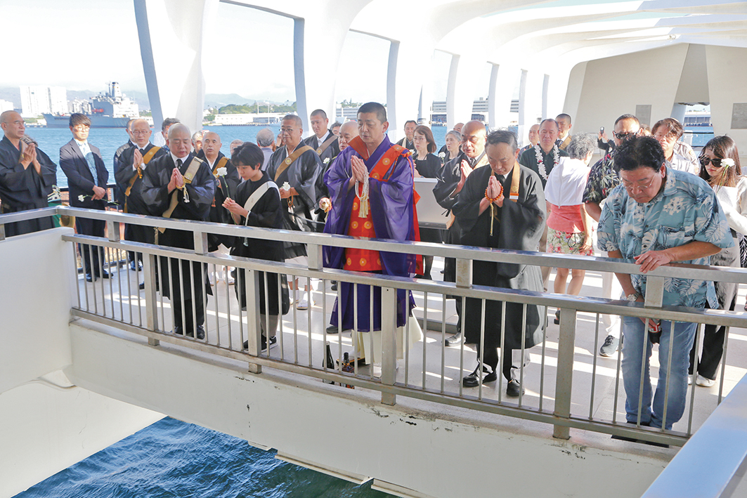 また追悼式がアリゾナ記念館で営まれた。パールハーバー国立記念公園のトム・レザーマン管理監督者の案内で船に乗り、同館を訪れた一行は、旧日本海軍が84年前に真珠湾に沈めた戦艦アリゾナ号の真上で自我偈とお題目を唱えた後、1人ひとりが海に眠る日米兵士の諸霊のために一輪の白い花を海に流した。