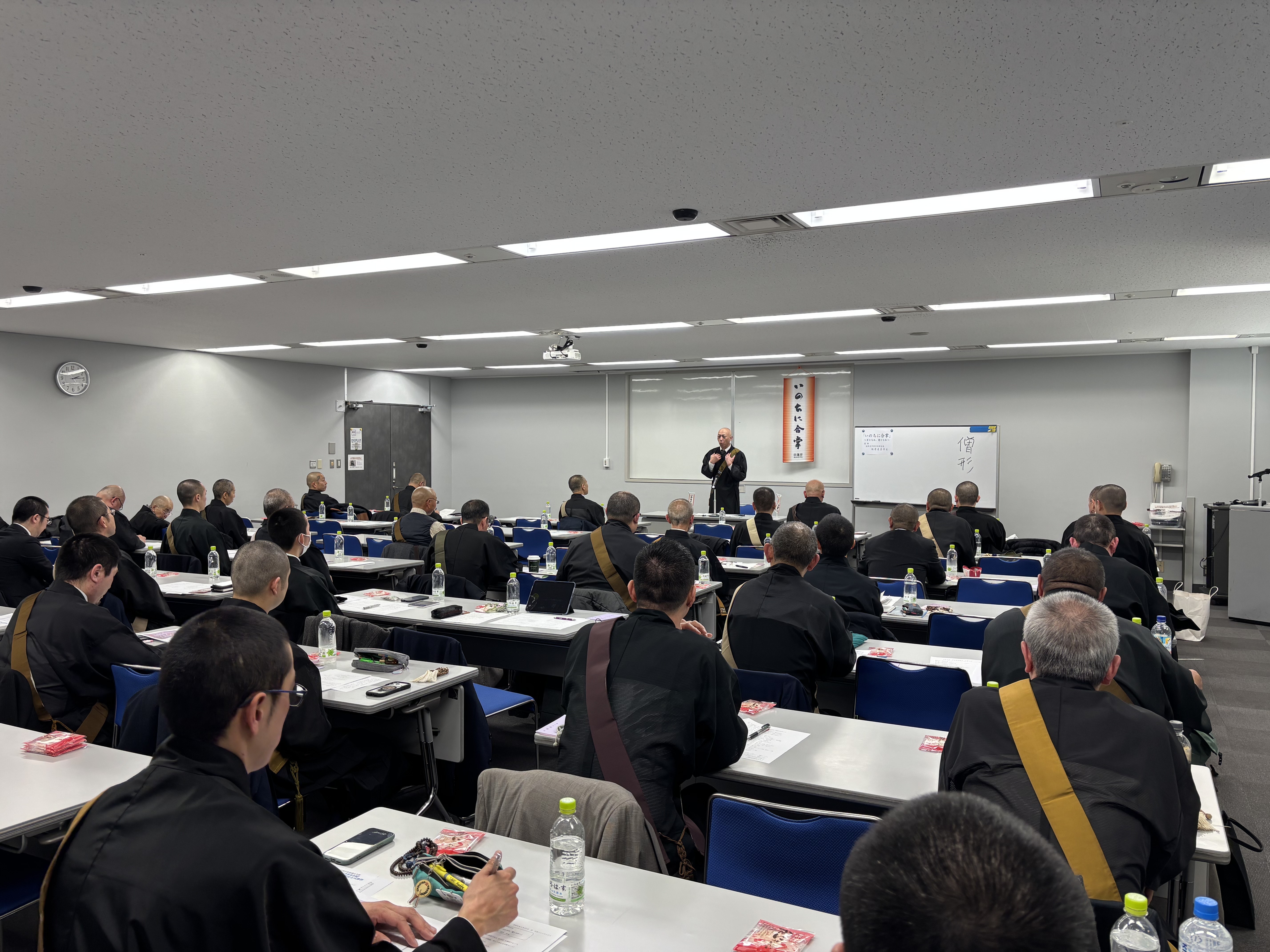 講演に続き、宗務院教務課長、雨宮通一師が登壇し、「日蓮宗の教育を考えよう 〜信行道場を中心として〜」と題して講義を行った。雨宮師は、日蓮宗僧侶養成の現状として、家庭生活と寺院生活の混在による修行環境の変化、師僧と弟子の関係の希薄化、身体的・精神的な負担を抱える僧侶の増加、学ぶ機会の減少などを挙げ、宗門教育の課題を提示した。