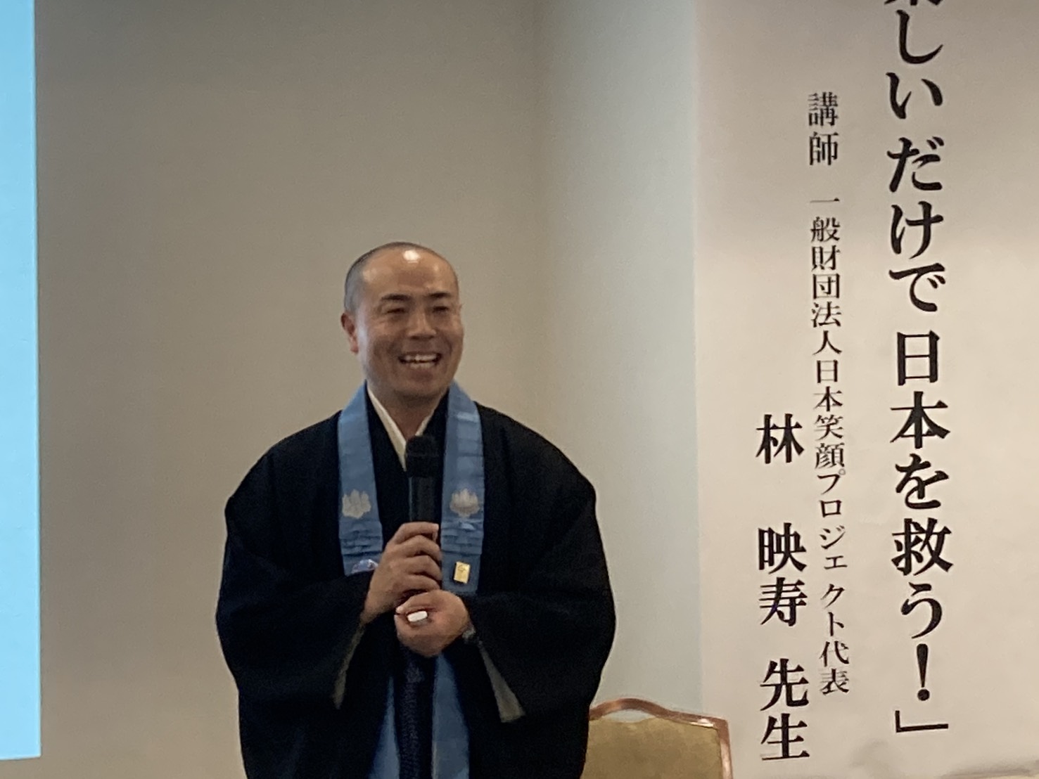 午後二時三十分、今年度は社会教化事業協会の担当による、教師研修会が開始。講師に長野県布施町 真言宗豊山派 浄光寺副住職・林映寿師を迎え「楽しいだけで日本を救う!」をテーマに講演が行われた。