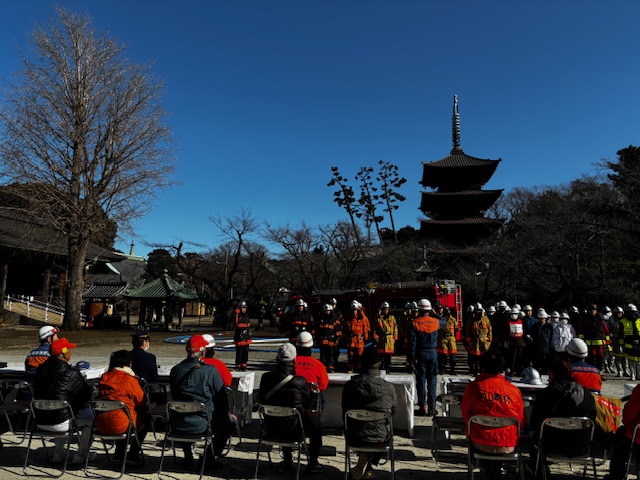 【千葉北】1月26日、法華経寺(新井日湛貫首)で防火訓練があった。この訓練は1949年1月26日、奈良県法隆寺金堂の国宝壁画が焼損したのを機に制定された文化財防火デーを教訓に市川市消防局や市川市と共に実施している。午前10時の訓練開始と共に祖師堂より火災が発生したという想定で119番通報後に、塔頭の浄光院(緑谷一雄住職)付属のみどり幼稚園5歳児約50名が祖師堂内より徒歩で避難を行った。また負傷者の救護や宝物の移動など同寺僧侶を初めとした参加者が手際よく行った。近隣住民で組織される自衛消防隊も訓練に参加するなど寺院関係者のみでなく地域一体となり消防訓練は進行した。避難後には消防車やポンプ車などが一斉放水を行い祖師堂に向け水が弧を描き見学者より歓声が上がった。訓練終了後市川市消防署長より訓練参加への感謝と「今後も失火には十分注意し宝物護持に努めましょう」と参加者へ語った。