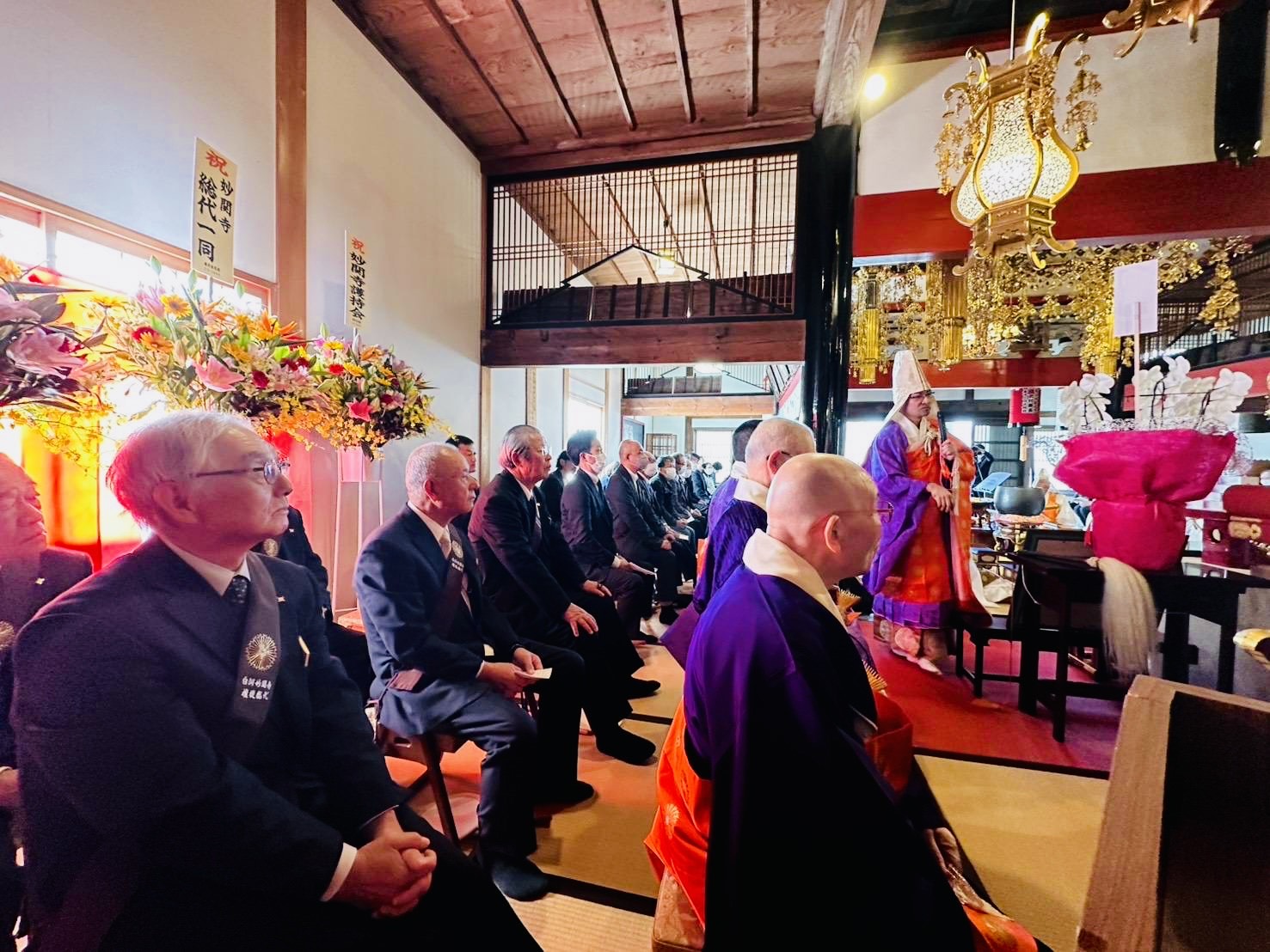 落慶式は管内の修法師を中心に出仕し、導師は住職の巻延彦師が務めた。御本尊や歴代の先師たちに法要の趣旨(庫裡の完成)を知らせる奉告文では、檀信徒たちにも内容が伝わるよう、わかりやすい言葉を用いて明瞭に読み上げられた。その中で住職は、大業をなすには「三つの力」を要するとし、天の時(良き頃合い)、地の理(有利な条件)、人の和(寺と檀信徒の絆)、これら三つが重なったことで、庫裡建て替えという大仕事を達成できたと報告した。