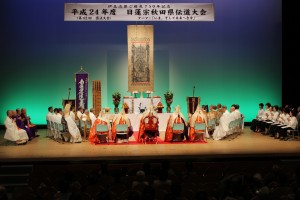 【秋田】宗務所(大森宣昌所長)主催の伝道大会(第四十二回護法大会)が九月二九日大仙市協和、市民センター「和ピア」で開かれ、僧侶檀信徒約三百名が参加した。寺庭婦人会の合唱につづき、第一部では「伊豆流罪ご赦免七五〇年記念、立正平和祈願、東日本大震災復興祈願大法要が営まれ、大森所長が導師、阿部龍翔修法師会長が修法導師を務め、管内僧侶総出仕のもと記念法要並びに震災犠牲者への供養と被災地の早期復興への祈り、お題目が捧げられた。