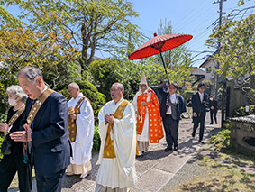 【静岡西】浜松市中央区三方原の法栄山通妙寺にて、春爛漫の穏やかな陽光がそそぐ4月12日、法燈継承式が行われ管内・法縁寺院より大勢の僧侶や檀信徒が参列した。式典冒頭、新住職への辞令伝達が行われ、その後第2世、師父田中円教上人から第3世、新住職田中教順上人に払子が継承された。新住職は奉告文言上のなかで院首上人が長きにわたって通妙寺の発展に邁進した功績にふれ、自身もさらなる山門興隆への精進を誓った。法縁来賓には本山玄妙寺より渡邉義生貫首、本山妙立寺より吉塚敬一貫首が臨席、挨拶に立った吉塚貫首は、ますますの寺門興隆をと熱く祝意を述べられた。また管内を代表して静岡県西部宗務所より中村宏人宗務所長が祝辞を述べ、院首田中円教上人にむけ身延波木井山にての生い立ちから通妙寺の発展まで長年の労をねぎらわれた。参列の大勢の檀信徒は院首上人と通妙寺のあゆみに思いを馳せ、また菩提寺のあらたな幕開けに臨んで熱心に参拝していた。