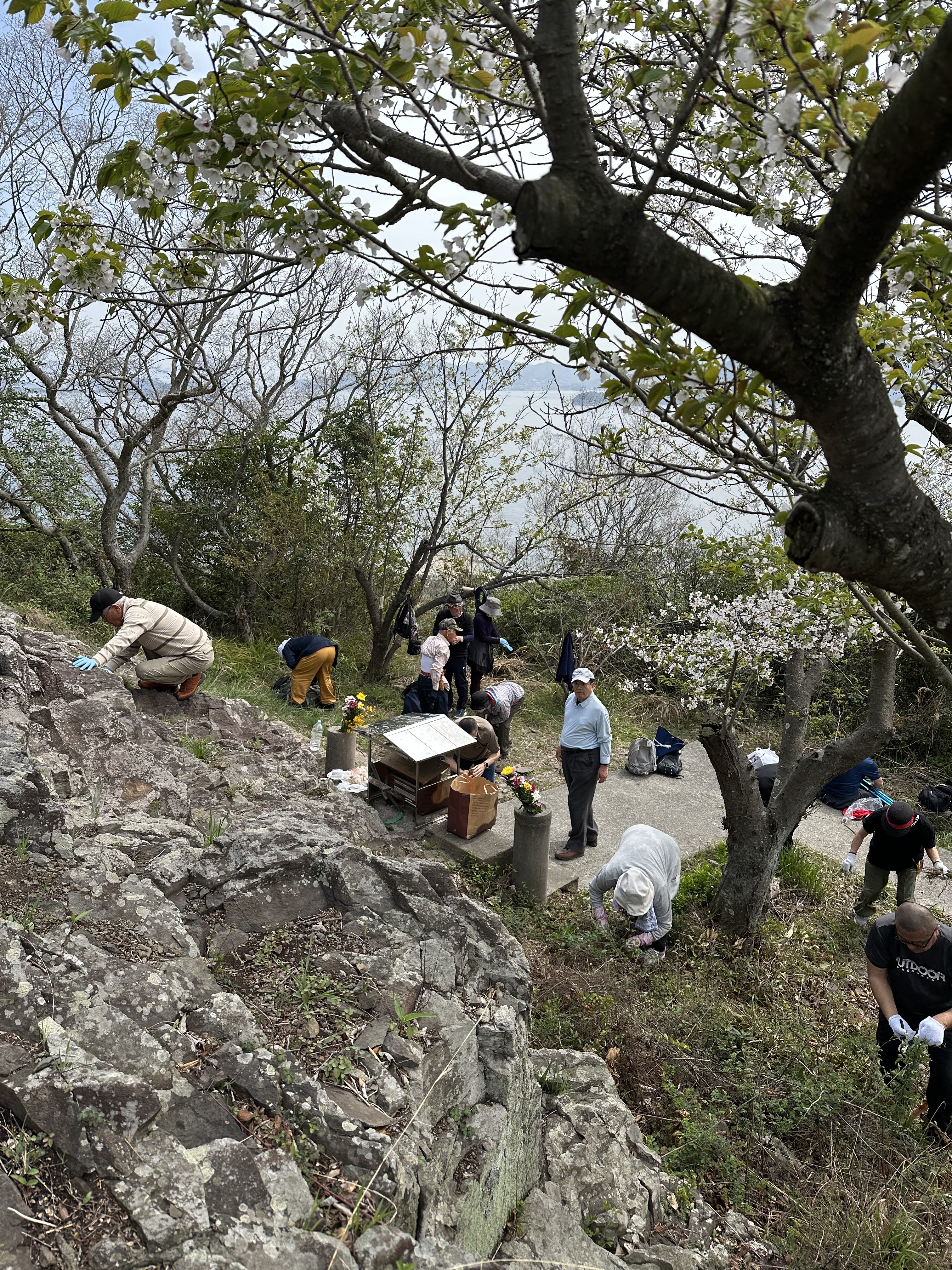 当日は教師8名、檀信徒寺族10名が参加した。女木港から銅像までの道のりは約30分の山道を歩くが、瀬戸内の温暖な気候の中、満開の山桜と穏やかな海を見ながら全員で標高153mの日蓮山の頂上を目指して登詣した。