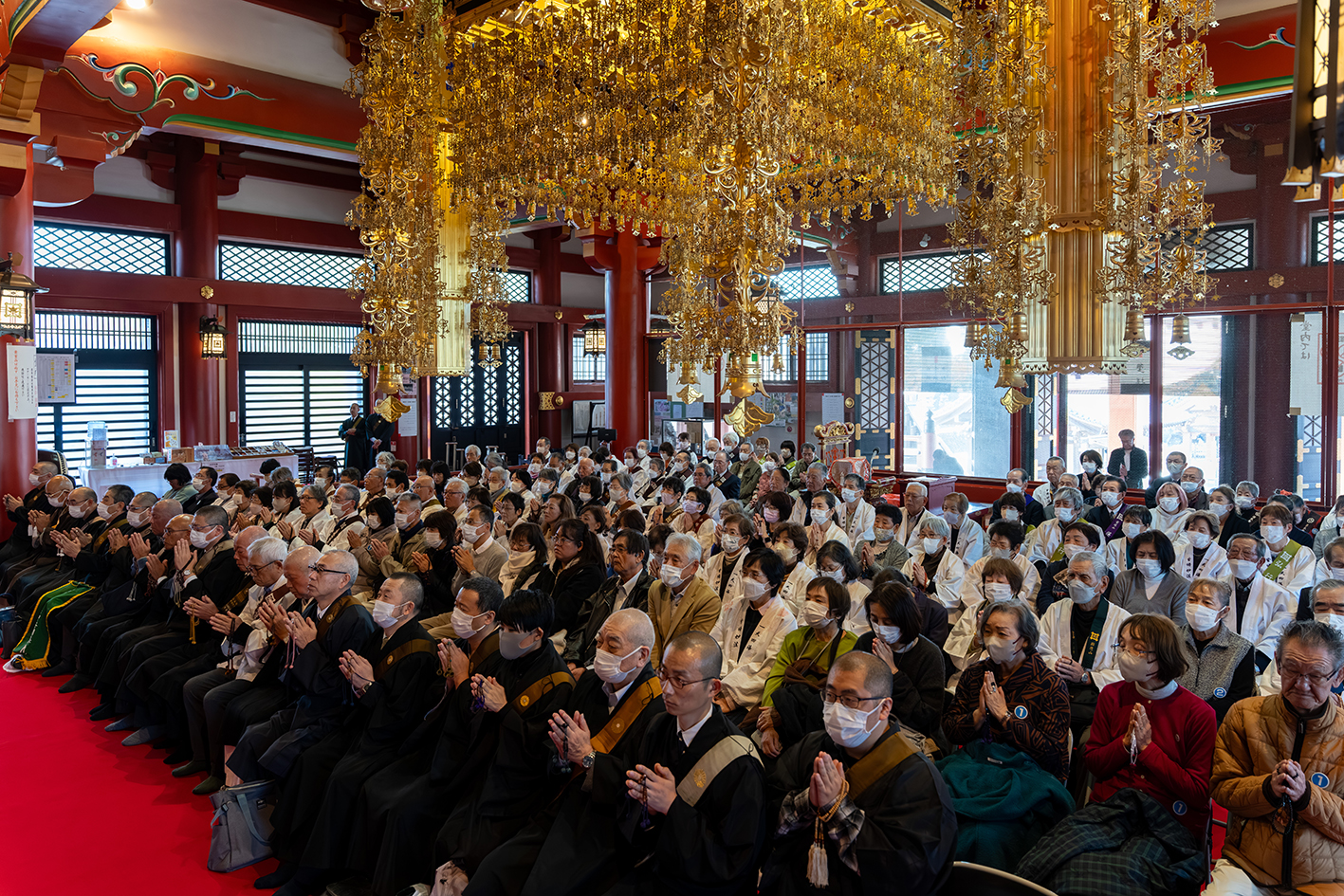 十三時三十分、大坊本行寺へ移動した一行は、池上宗仲公邸の仏間であり日蓮聖人が最後『立正安国論』ご講義をなされた御臨終の間において中野日演貫首猊下導師のもと御開帳。