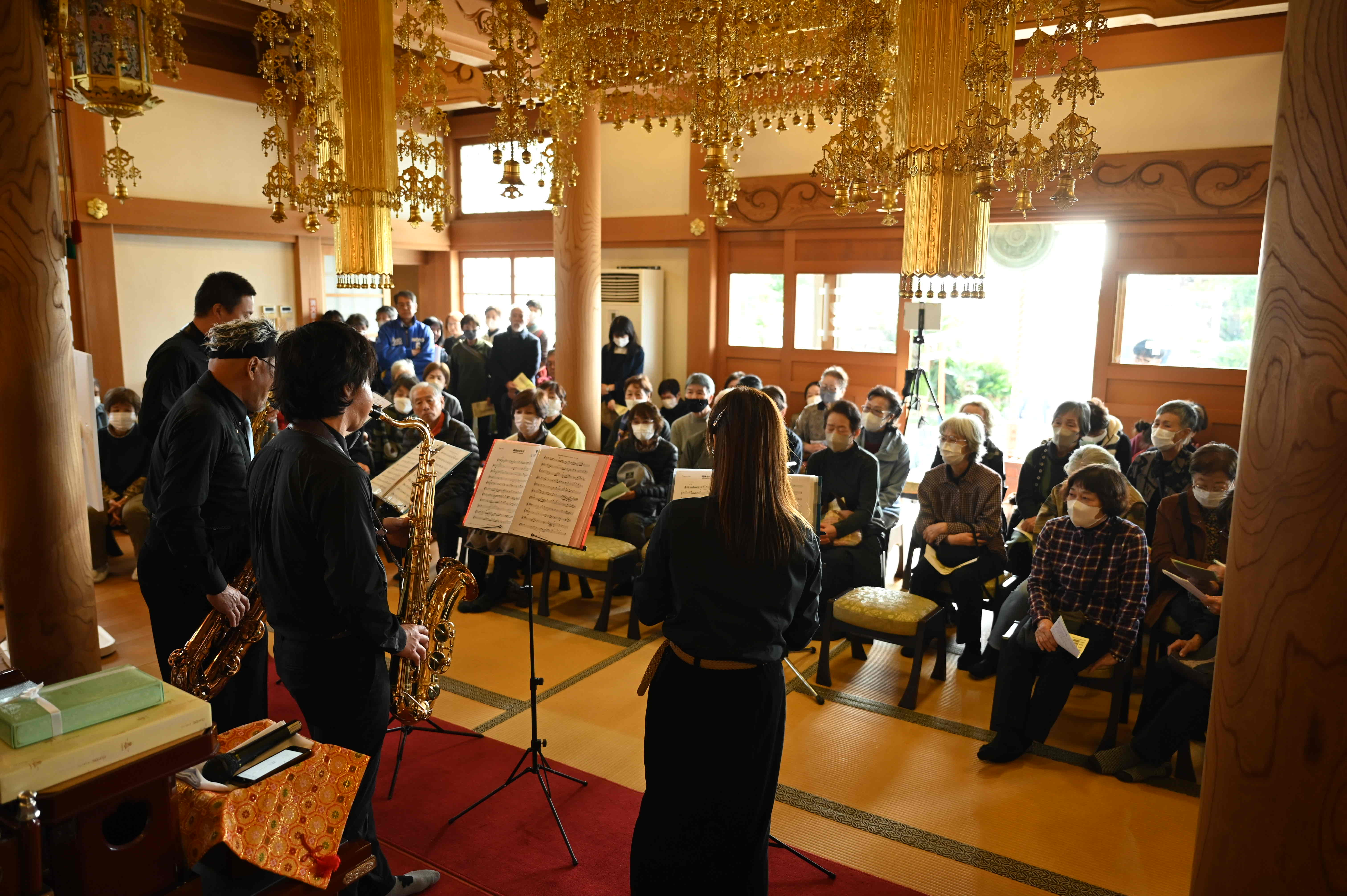 【神奈川3】11月23日(日・勤労感謝の日)、小田原市蓮華寺(羽田鳳竜住職)にて「かみふなかミニコンサート」が開催された。当日は好天に恵まれ季節外れの暖かい陽気のなか、檀信徒や地域住民述べ200名を超える来場者がお寺に訪れた。今年で4回目となる今回も演奏形態やジャンルは問わず、これまでで最多の計16組が出演し、運営スタッフは全て地元住民のボランティアが協力した。午前10時の演奏開始から会場となった本堂には座りきれない程の来場者が訪れ、終演の午後5時まで多種多様な音楽の音色が来場者を楽しませた。また客殿では参加者が自由に交流できる空間を設け、地元民生委員を中心となり早朝よりおにぎりや豚汁の軽食を準備し、交流の一助となった。企画発案者で自身もサックス四重奏と雅楽演奏で出演した羽田鳳竜住職は「今年もこうして盛大に開催できたことをスタッフ・出演者・来場者、全ての皆さまに感謝します。出演者や来場者の皆さんが笑顔やたくさんの拍手で会場が暖かい雰囲気に包まれたのは大変感慨深い一日でした。是非また来年もお会いしましょう」と最後の挨拶を述べた。