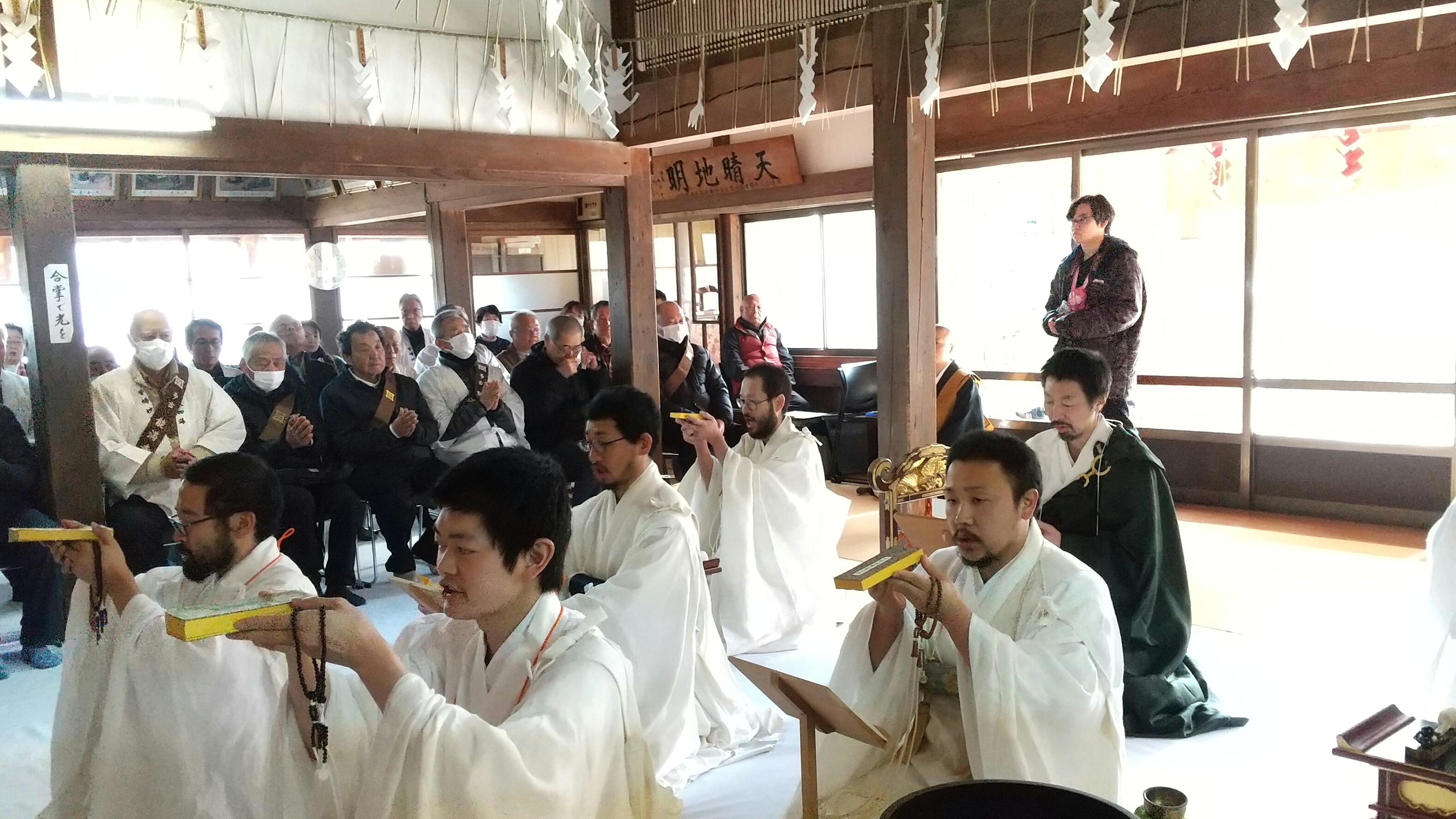 【千葉東】令和八年二月十二日 全堂代表を勤め第五行を成満した重田観真住職の帰山奉告式が檀信徒七十名程・近隣寺院四十名程と荒行成満僧六名で厳修された。
