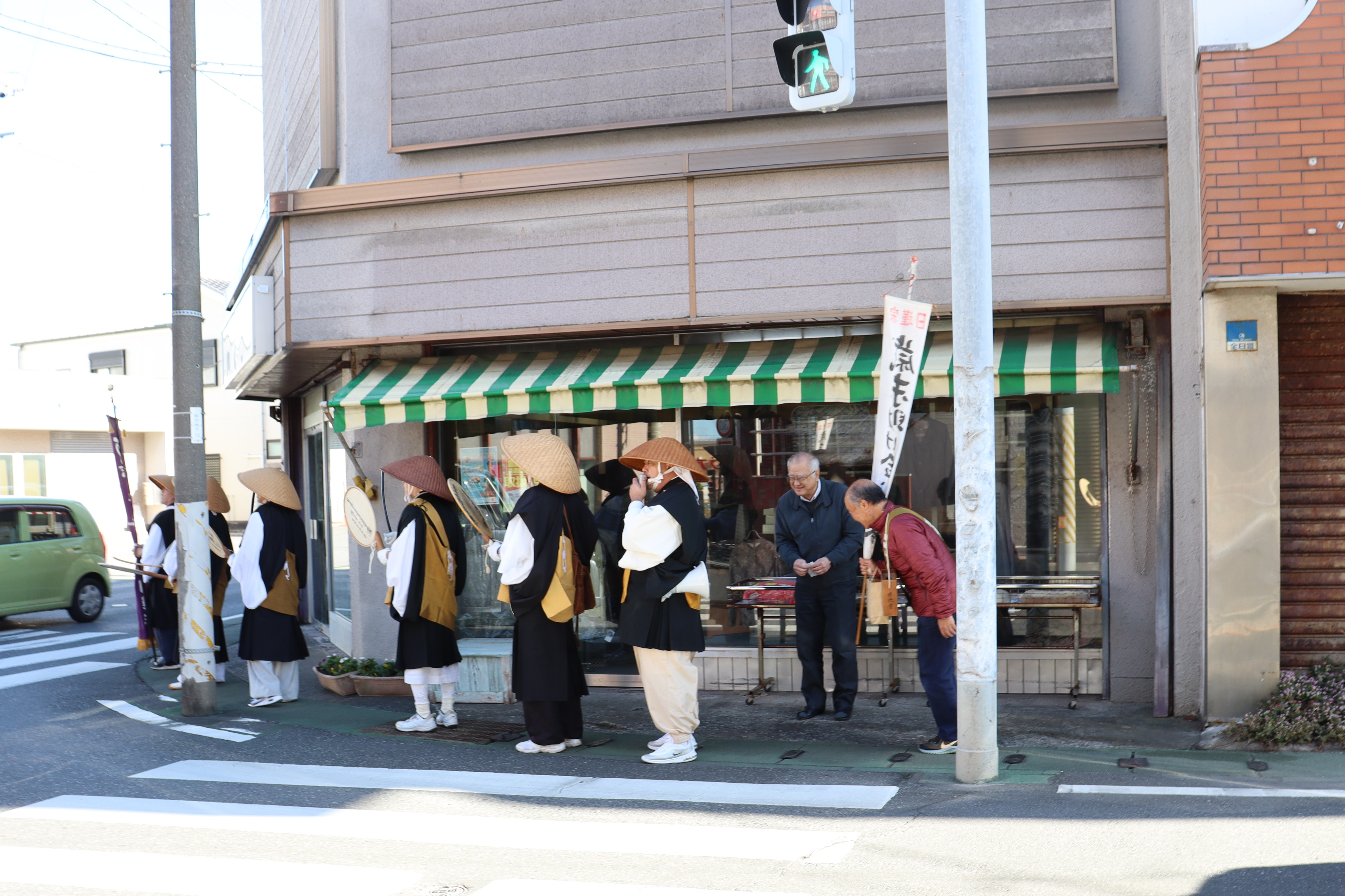 道すがら、団扇太鼓の音が聞こえると檀信徒問わず市民の方々は寄付に協力をしてくれ、お礼には交通安全を祈念したお守りが手渡された。