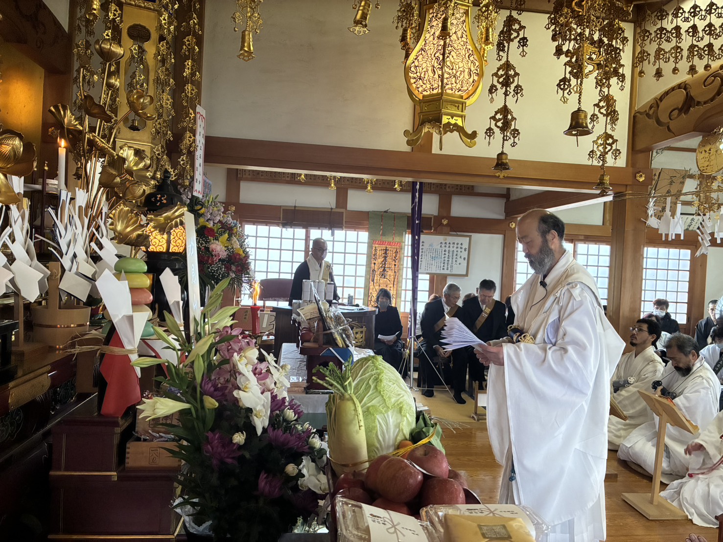 【大阪豊能】加行所第再々行を成満した桑木信弘住職の帰山奉告式が2月20日、能勢町妙圓寺で行われ、僧侶・檀信徒ら約70人が参列した。