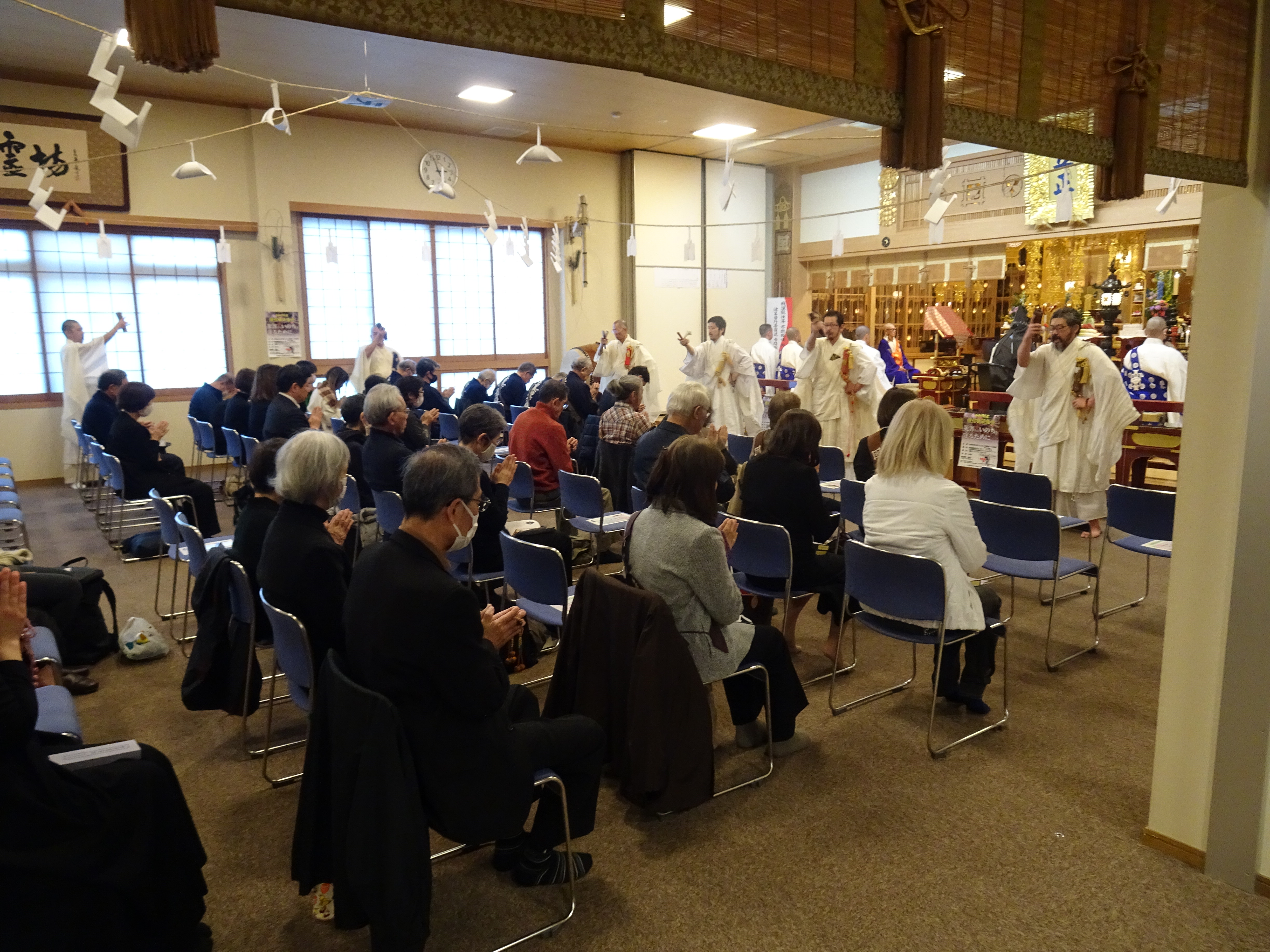 【兵庫東】加行所を成満した兵庫県東部の二師が、それぞれの自坊で帰山式を行った。参行を成満した山中是道上人の帰山式が、2月19日、神戸市法伝寺(自坊)で、檀信徒・寺族50人が見守る中、盛大に行われた。朝からの冷え込みも相まって、寒水を水垢離する姿に、檀信徒が熱心に手を合わせていた。山中師は『有り難いという言葉の意味を感じさせていただきながら、百日間修行させていただきました。これからは皆様の幸せを真摯に祈らせていただきいと思っております。』と謝辞を述べた。