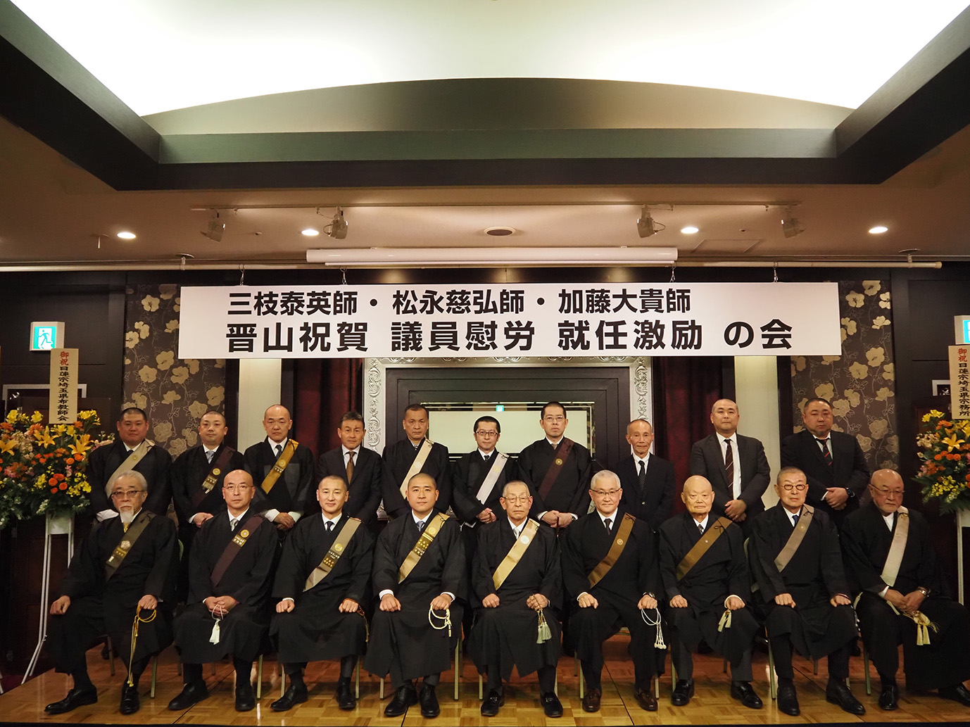 【埼玉】令和8年3月12日、さいたま市のロイヤルパインズホテル浦和において、三枝泰英師の本山堺妙國寺第63世加歴晋山祝賀会、並びに松永慈弘師宗会議員退任慰労会、加藤大貴師宗会議員就任激励会が開催され、管内より有志61名が参加した。
