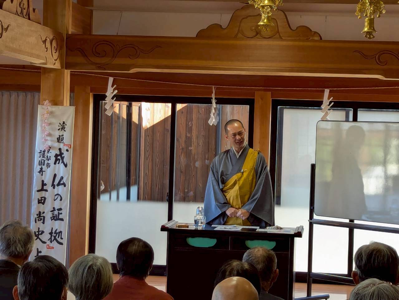 【福井南】11月15日、福井県小浜市の源應寺で檀信徒のつどいが開かれ、講師として上田尚史上人が招かれた。地元の檀信徒ら約40人が参加し、上人の法話に耳を傾けた。