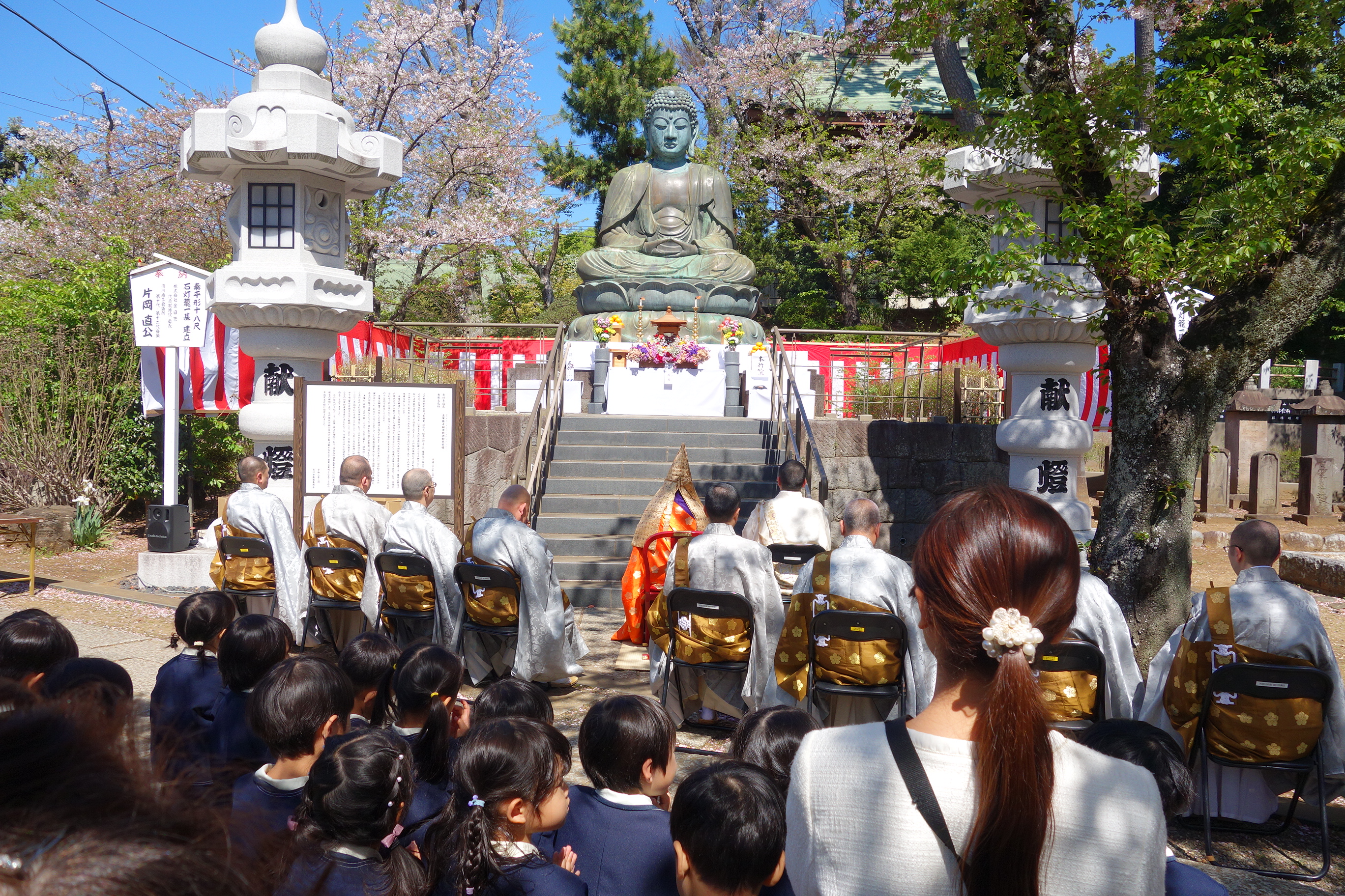 【千葉北】法華経寺では4月8日釈尊降誕会を厳修した。当日は午後1時より法要が厳修された。法要に先立ち隣接の浄光院(緑谷一雄住職)付属のみどり幼稚園年長児40名が白象とともに行列した。行列開始前法華経寺僧侶より「怪我をしないようにゆっくり歩きなさい」という声がけがあり、年長児は真剣な表情で聞く姿があった。桜が舞い散る中、白象と共にゆっくりと行列する姿へは沿道の参拝者より大きな歓声が上がった。行列後そのまま法要に参加し代表園児2名が誕生仏へ献茶を行った。背が小さく付き添いの教員に抱え上げられての献茶であったが小さな手を合わせ取り組んでいた。県内より来訪したという参拝者は「桜も美しく、法要にも参加できいい記念になった。また幼稚園児が法要に手を合わせ参加する姿に涙が出そうになった。自分も日々のお勤めを頑張りたい。」と語っていた。