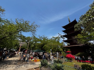 【千葉北】法華経寺では4月15日から18日まで千部会を厳修した。期間中は出仕の僧侶が法華経を千回読誦し供養と祈願を行った。春の千部会、秋のお会式に合わせ境内では骨董市も実施され、期間中の好天もあり多くの来場者で賑わった。五重塔前では普段閉扉されている前庭で野点が行われ希望者が抹茶を楽しんだ。鶯の声も響き暖かな一日を楽しんだ。