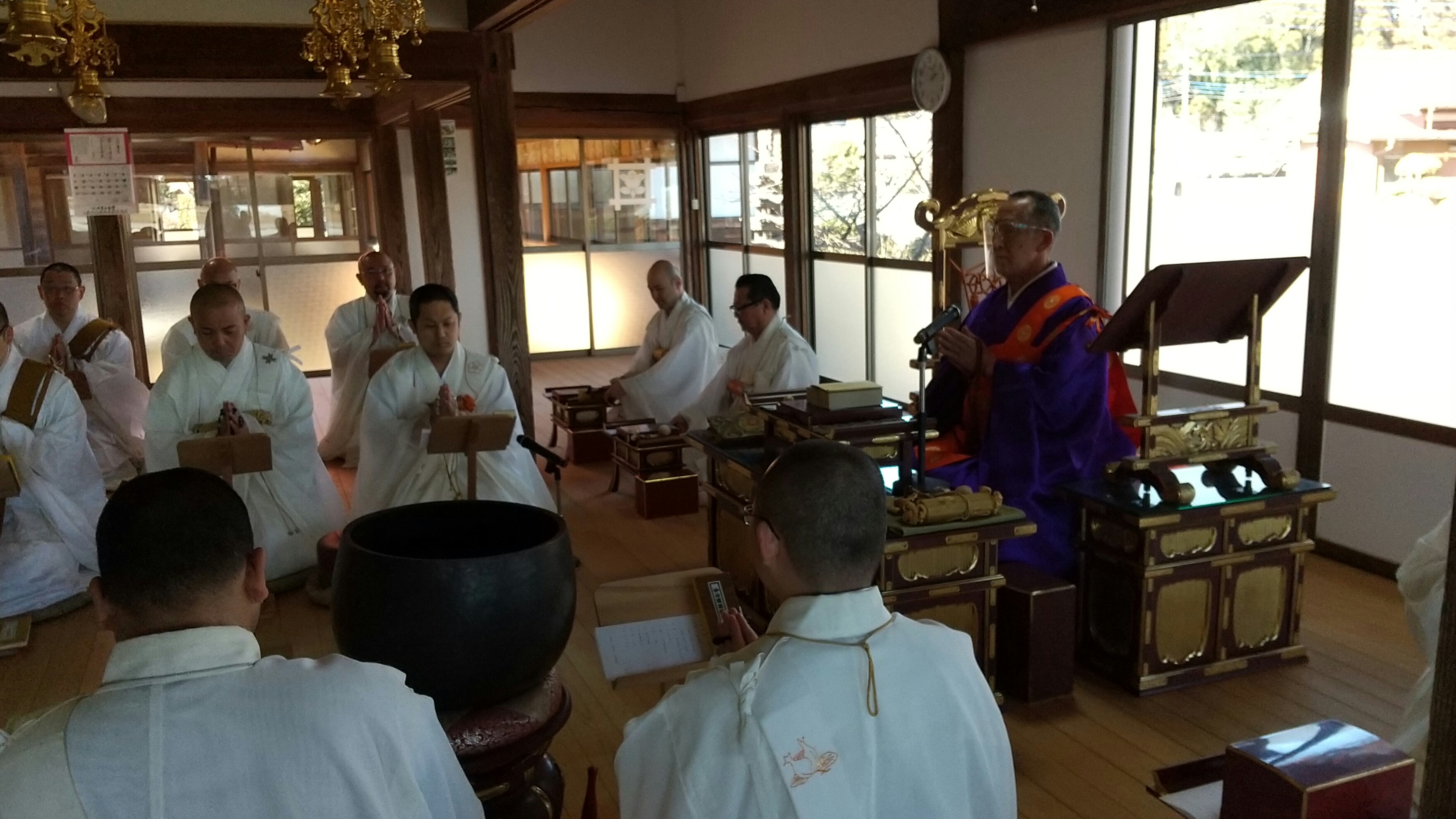 【千葉東】令和八年二月十二日 全堂代表を勤め第五行を成満した重田観真住職の帰山奉告式が檀信徒七十名程・近隣寺院四十名程と荒行成満僧六名で厳修された。