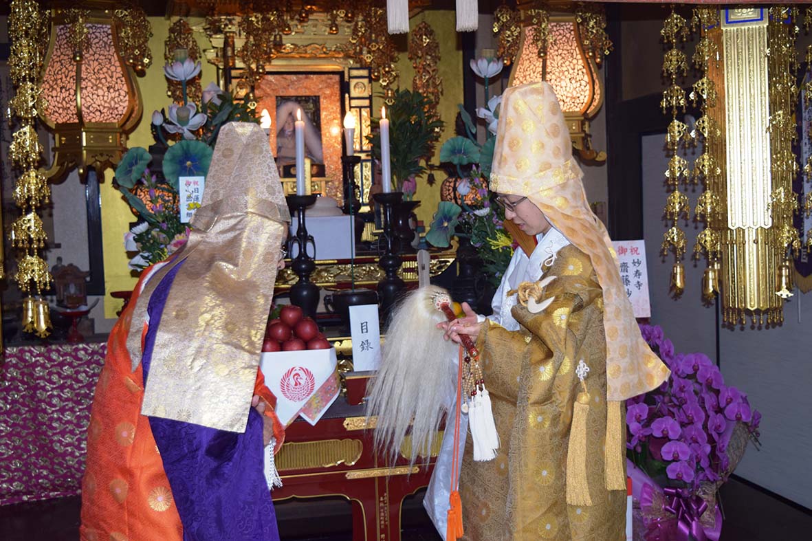 【島根】出雲市本住寺で10月23日、第17世 米原実信師から第18世 椋和香師への法灯継承入退寺式が行われ、僧侶檀信徒約80人が参列した。当日は式に先立ち、練り行列、稚児による献華が行われた。式では本年白寿を迎える実信前住職から払子を継承された和香新住職が入寺奉告文を読み上げた。謝辞で和香新住職は「師父である前住職は温厚だったが芯は固く物事に動じない、‘’柳に雪折れなし‘’というような僧侶だった。私も師父のような僧侶を目指したい。」と結んだ。