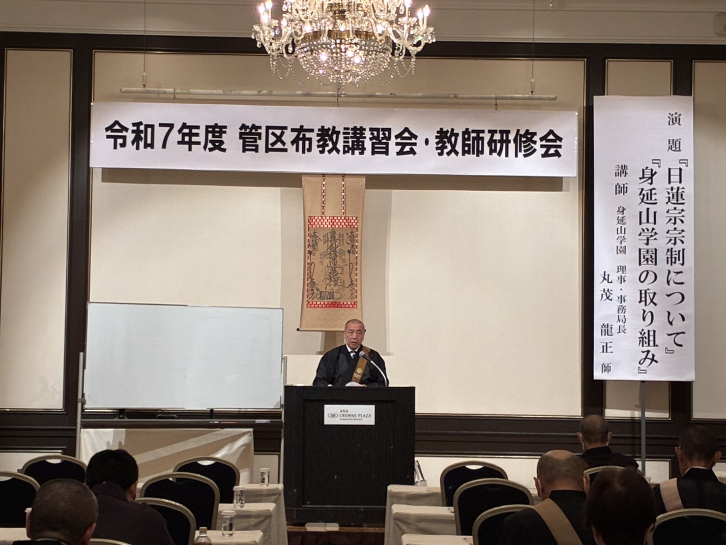 始めに、布教師会会長(伊藤是光上人)導師による法味言上。続けて会長から挨拶の後、講師である身延山学園理事・事務局長 丸茂龍正師による「身延山学園の取り組み」・「日蓮宗宗制」についての講演を頂戴した。