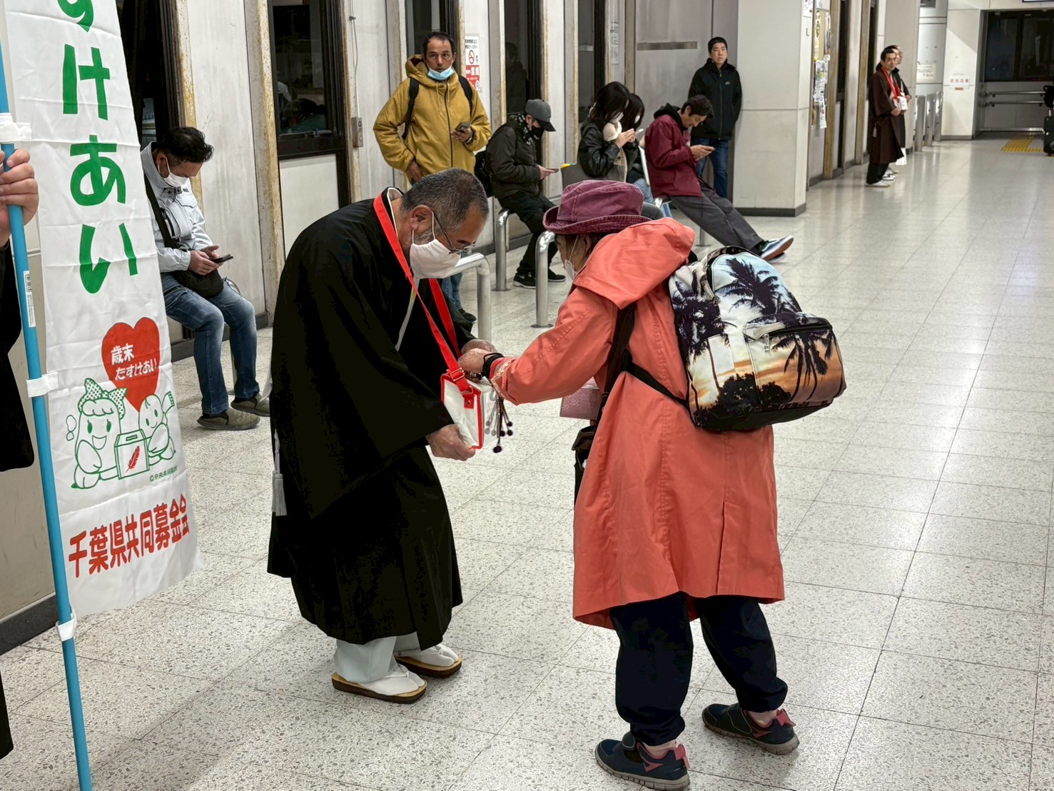 【千葉西】12月11日市原市JR八幡宿駅に於いて千葉県西部社教会による歳末たすけあい募金が行わた。江口隆晶上人(西部社教会会長)を筆頭に法衣姿の僧侶たちが駅頭に立ち、通行人や駅を利用する方々に慈愛の精神を広めると共に募金協力を呼び掛けた。帰宅時間に重なった事もありサラリーマンや学生、様々な人が足を止め募金に協力していただき、集まった募金は地元の福祉協議会に寄付され地域福祉に活用される。