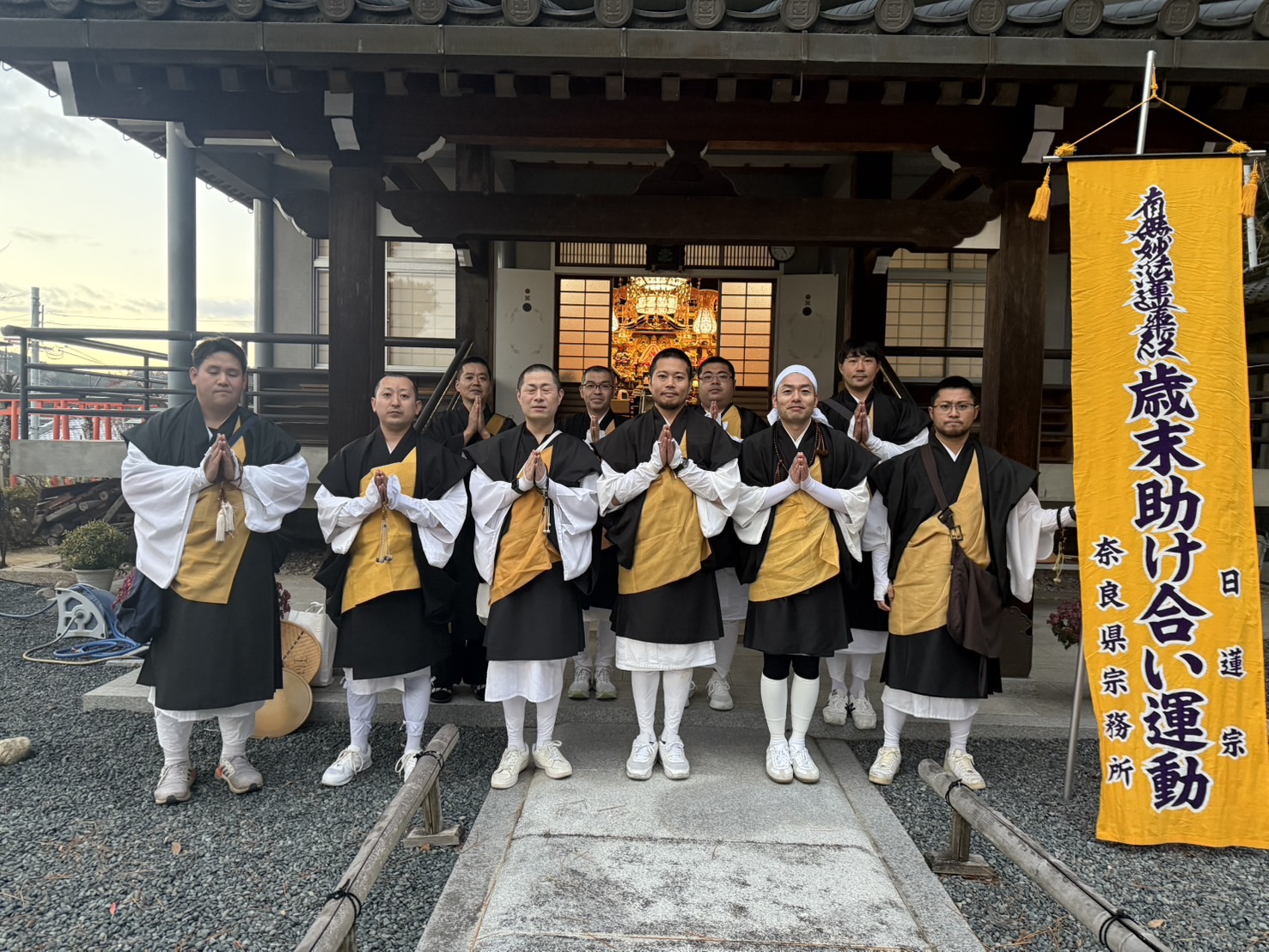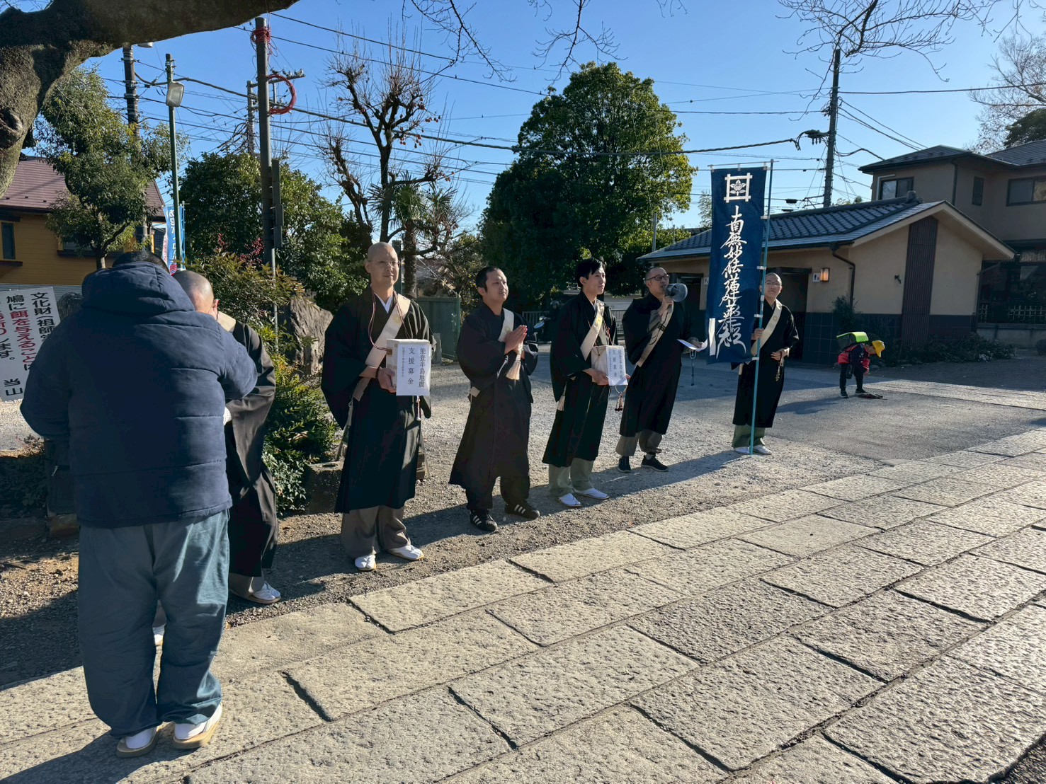 【 奈 良 】十 二 月 九 日 に 宗 務 所 ( 小 野 瑞 正 所長 ) は 歳 末 助 け 合 い 行 脚 を 開 催 し 、 宗 務 所 と 管 内 教 師 と 青 年 会 の 僧 侶 合 わ せ て 十 一 名 が 参 加 し た 。 宇 陀 市 長 隆 寺 を 出 発 し 、 団 扇 太 鼓 を 打 ち 鳴 ら し て 大 き な 声 で お 題 目 を 唱 え 、約 二 時 間 半 に 渡 っ て 行 脚 を 行 っ た 。こ の 日 、 集 ま っ た 浄 財 は 田 原 本 町 善 意 銀 行 へ 納 め ら れ た 。地 元 の 中 の 檀 信 徒 の 一 人 は「 本 当 に 感 動 し ま し た 。 ま た こ の 様 な 機 会 に 参 加 さ せ て 頂 き た い で す 。 」 と 喜 ん で い た。