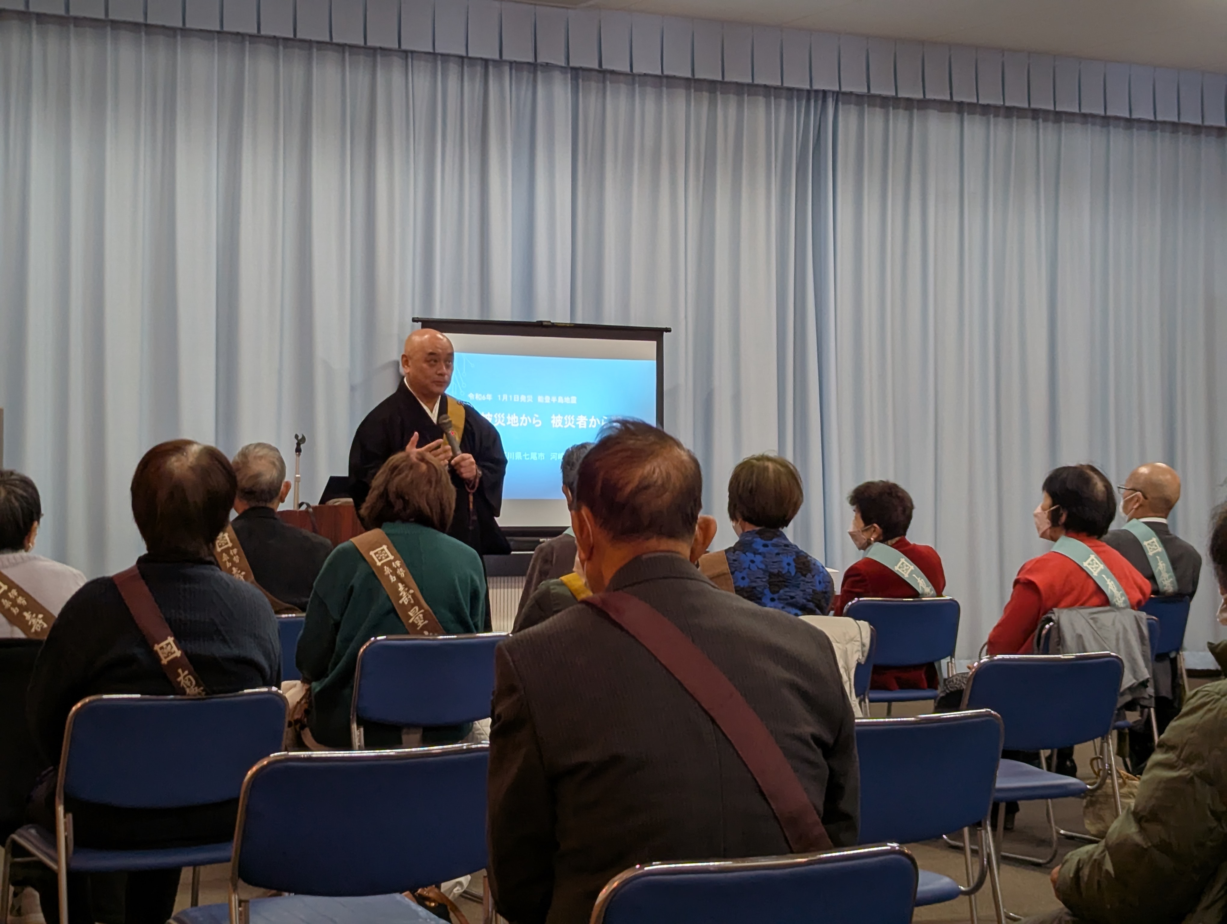 13時30分から開会式が行われた後、河崎俊宏上人(七尾市本延寺住職、輪島市妙相寺住職)により被災体験に基づく講話が行われた。2024年の能登半島地震により、本延寺が大規模半壊、妙相寺は全壊する被害を受けた。高台にあるお寺の裏が避難所となり何百人をまとめる所から始まり、地域の人の心の拠り所となるよう仮本堂を建てる所までの実体験から、日常が非日常になる事、物理的に備え、宗教に携わる者の心がけを保ち続けることの重要性を説いた。